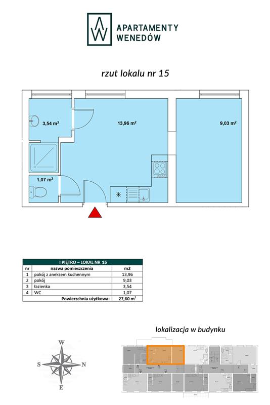 Ta oferta obejmuje położny na 1 piętrze lokal nr 15 o pow. 27,60 m2 składający się z: