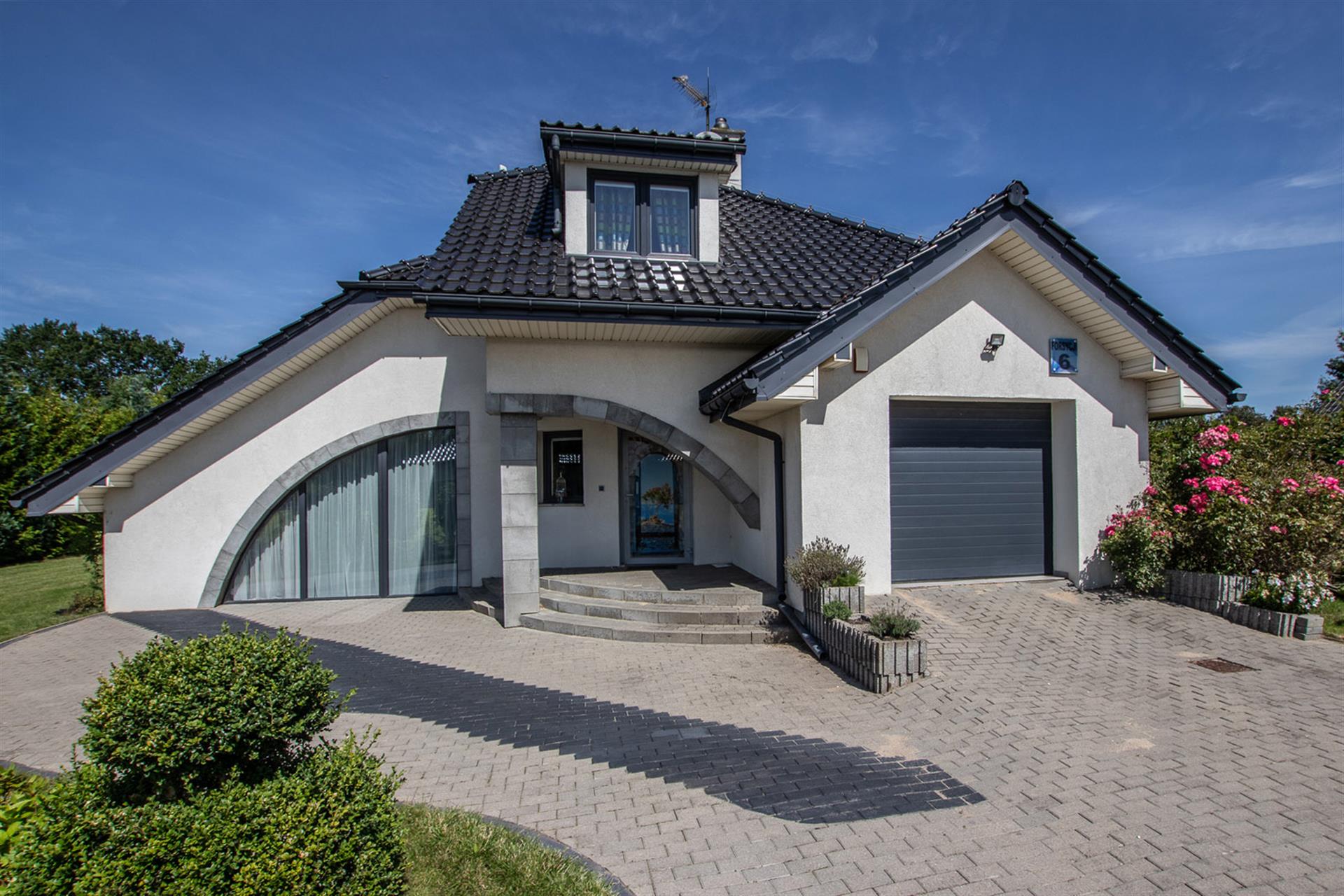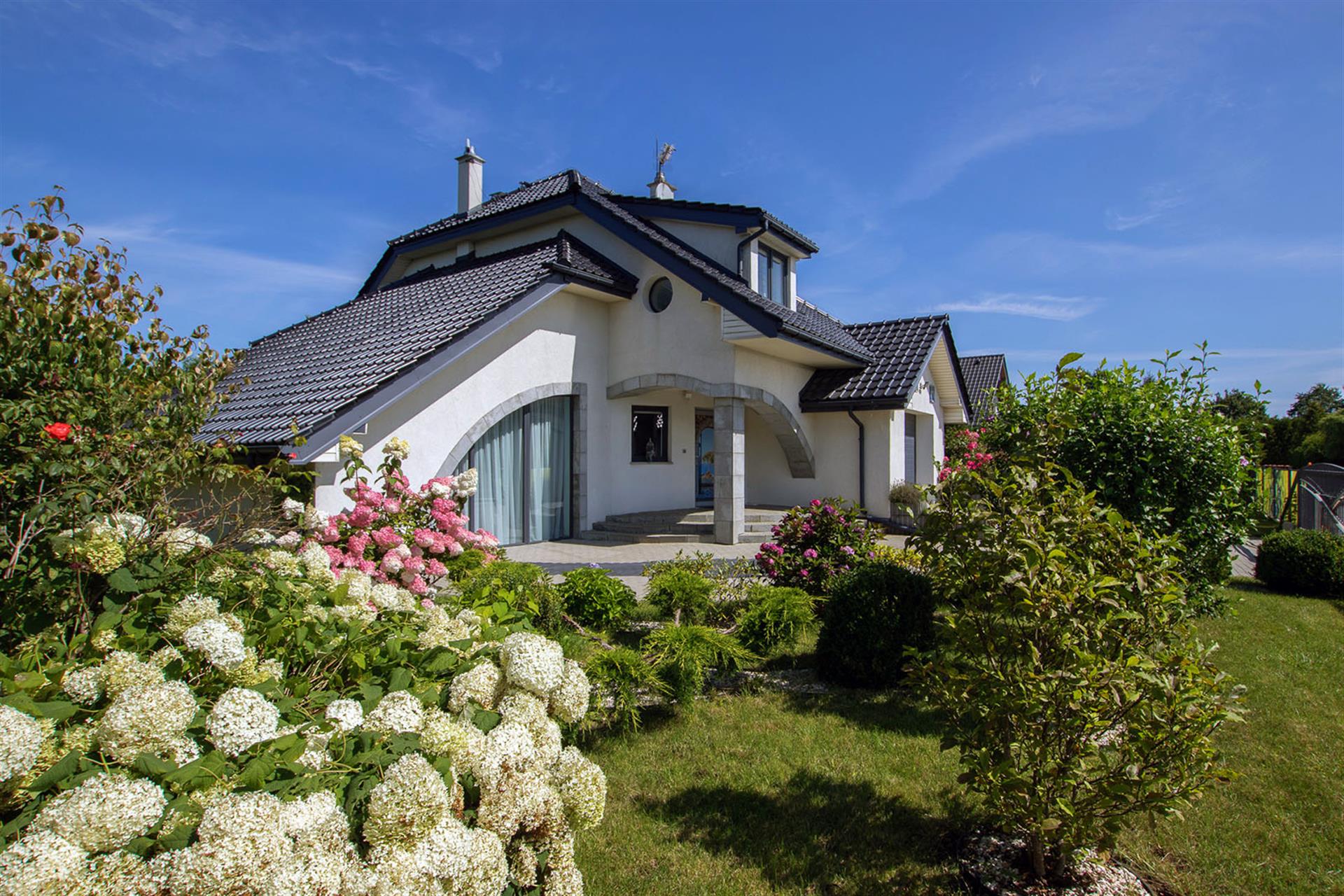 Dom 2-kondygnacyjny z garażem jednostanowiskowym w bryle budynku i zagospodarowaną działką z licznymi nasadzeniami drzew i krzewów.