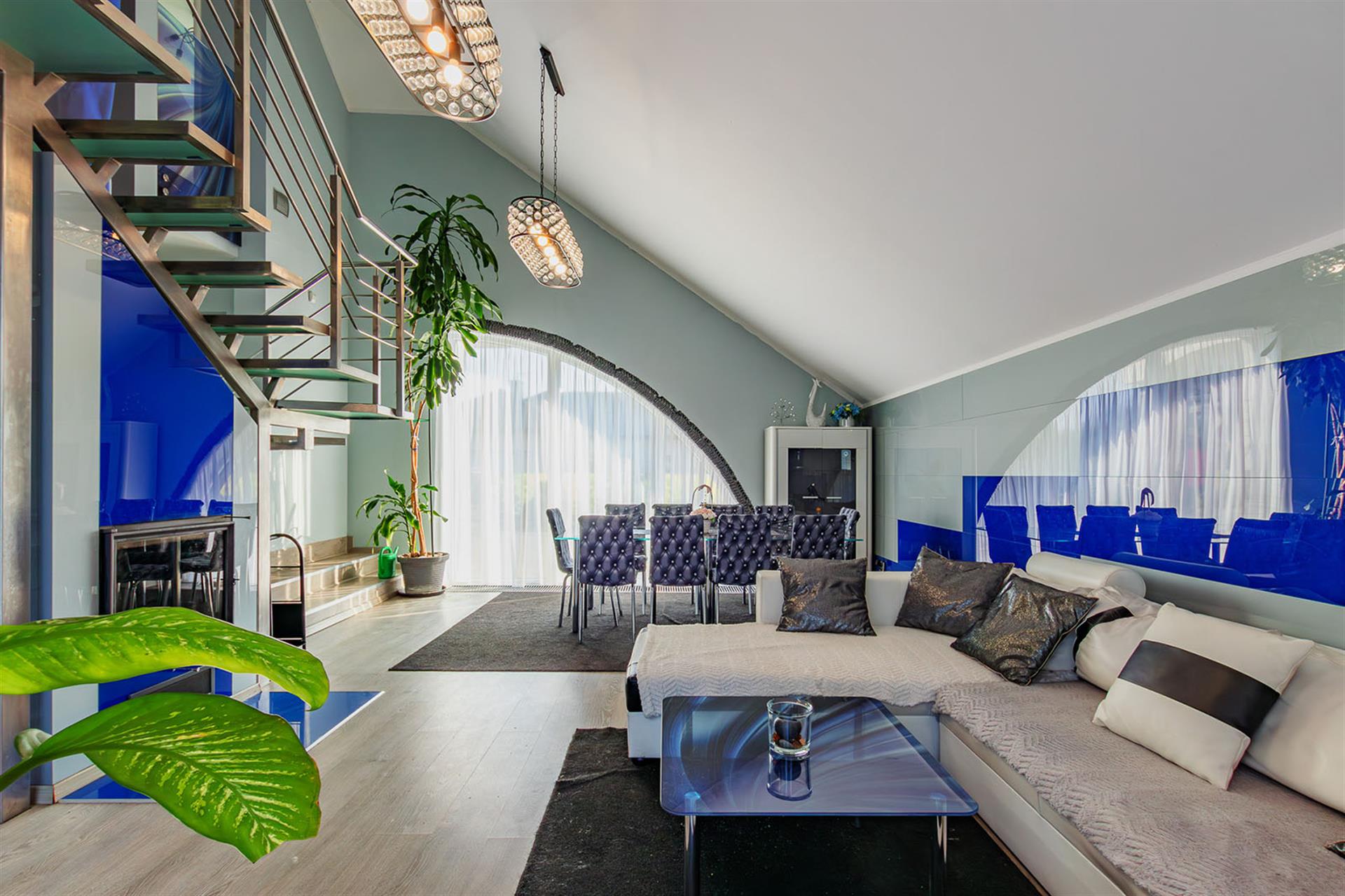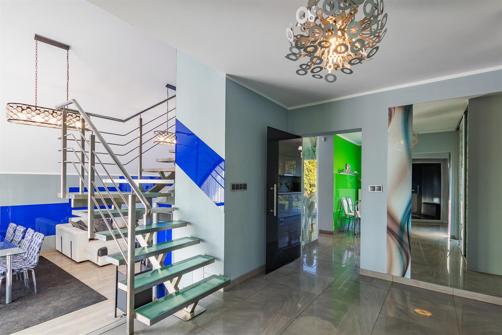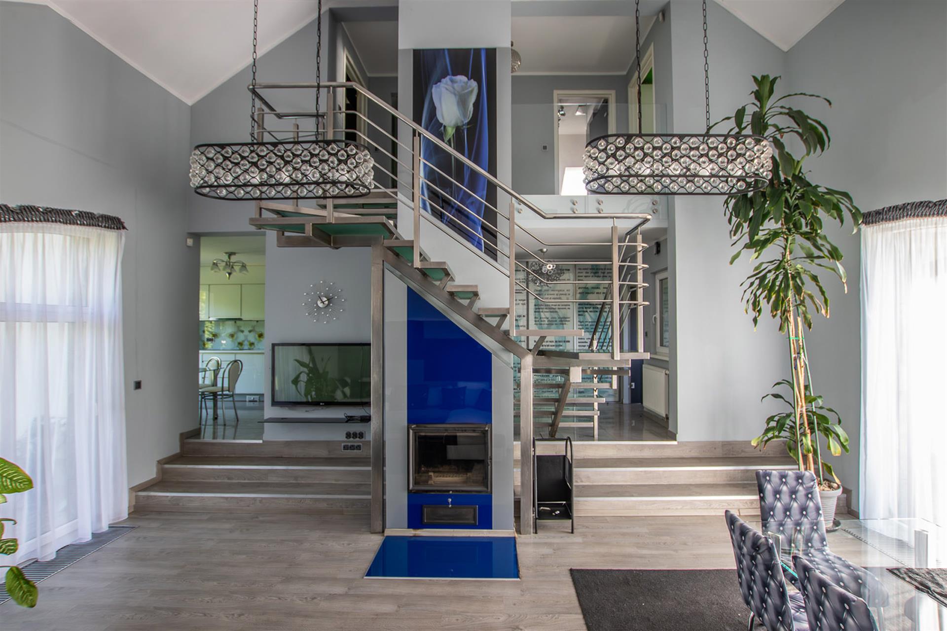 Na piętro prowadzą szklane schody bezpośrednio na antresolę z której mamy widok na cały salon.