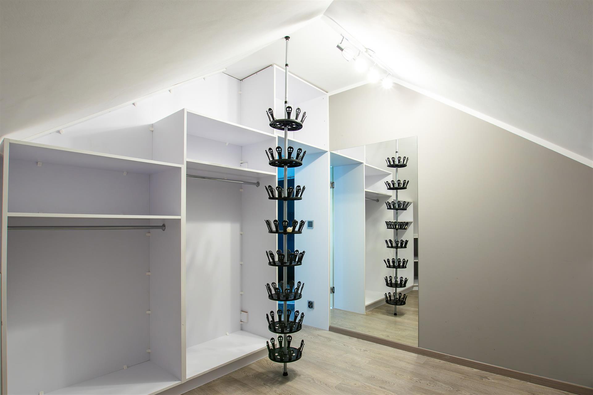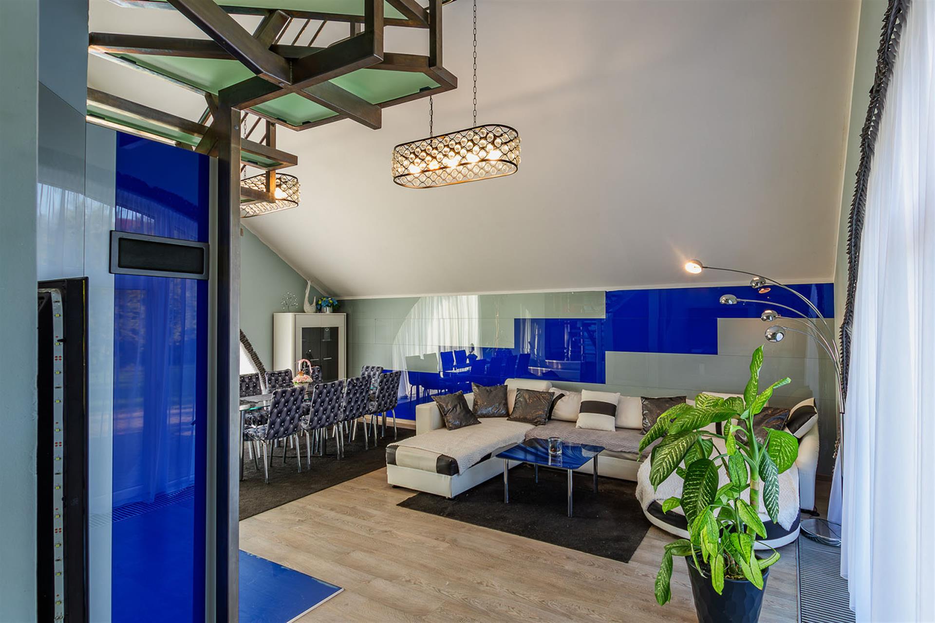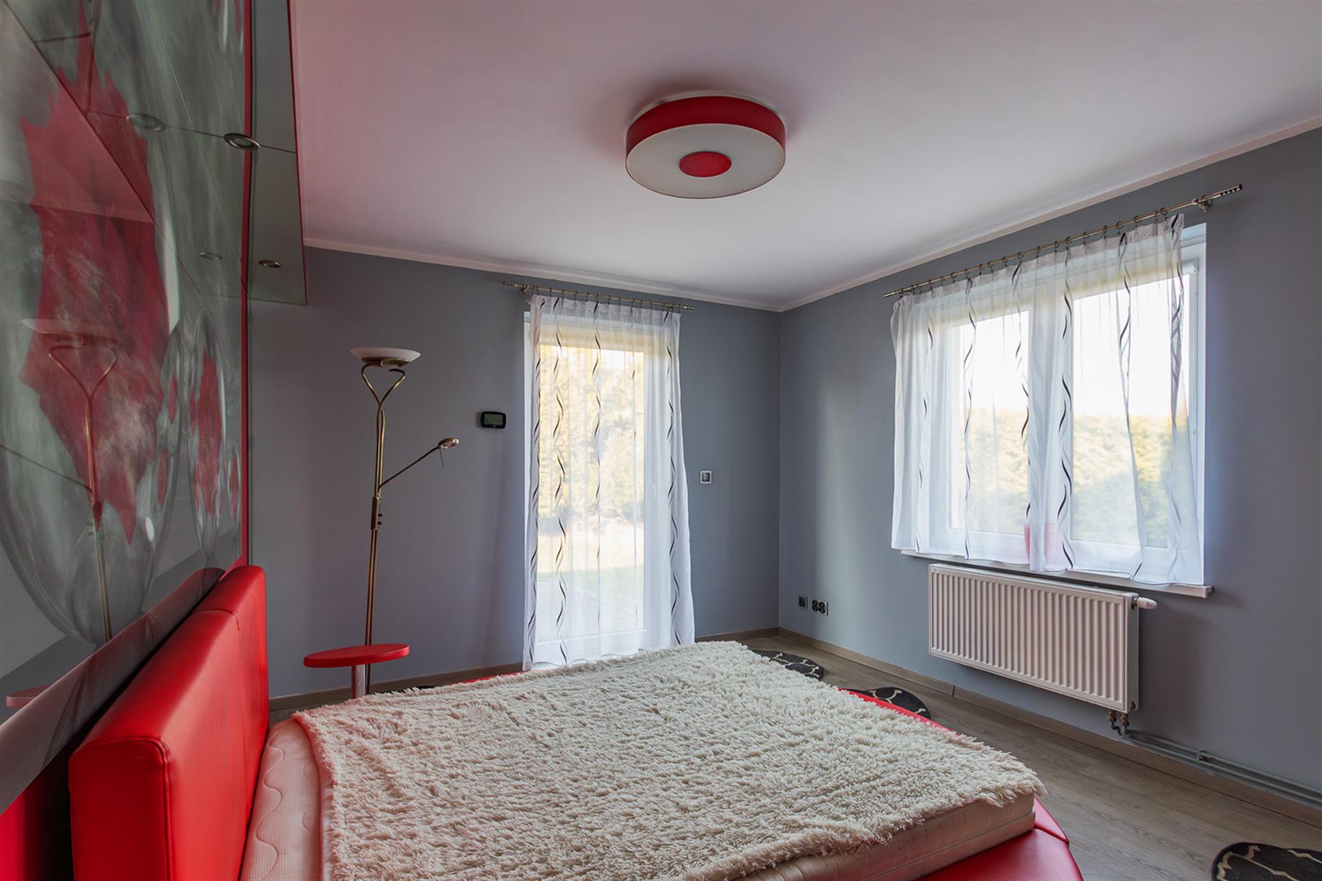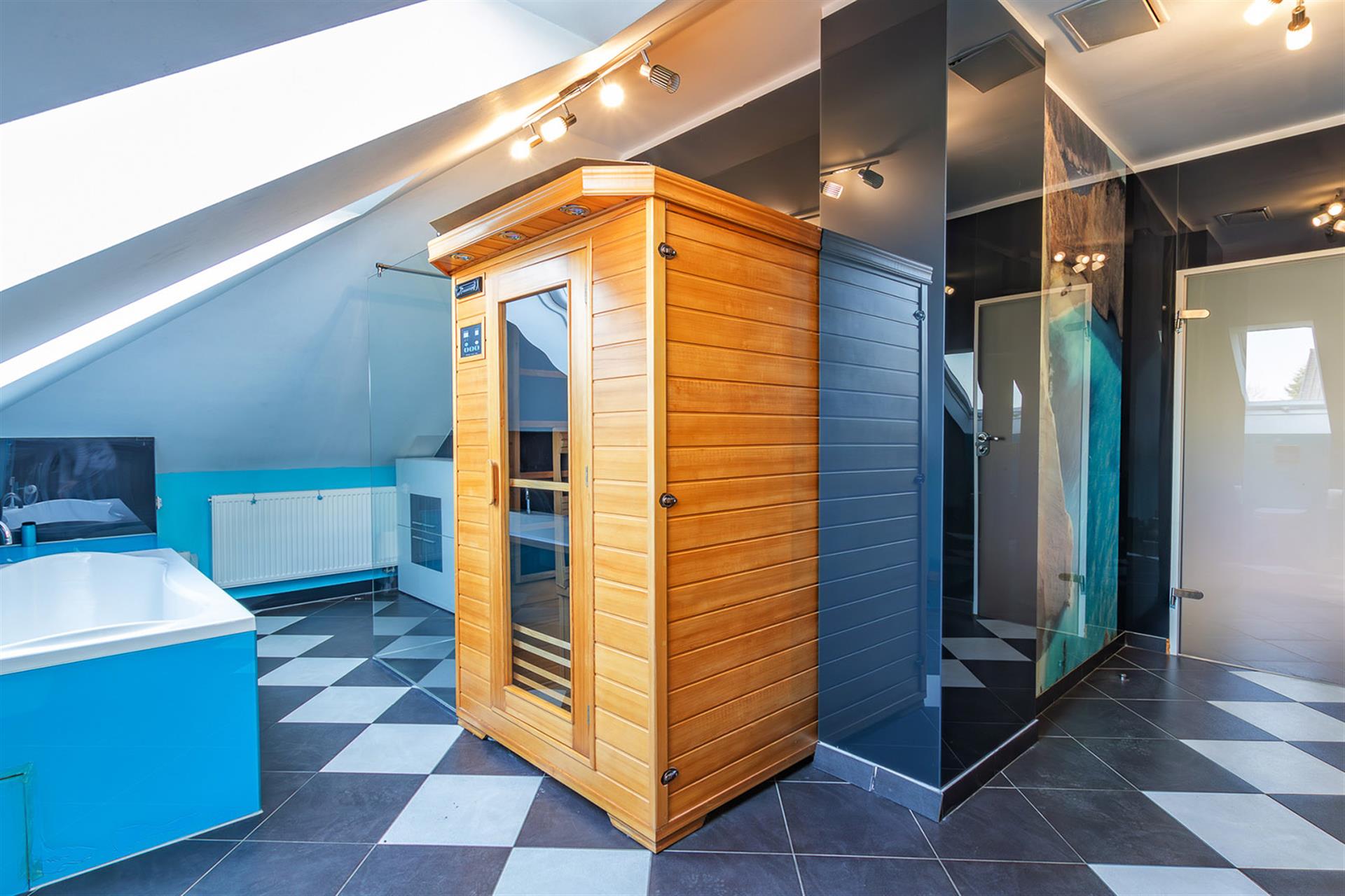 Piętro: trzy funkcjonalne pokoje, jedna z sypialni z dużą przeszkloną garderobą, pokój kąpielowy z wanną i z sauną.