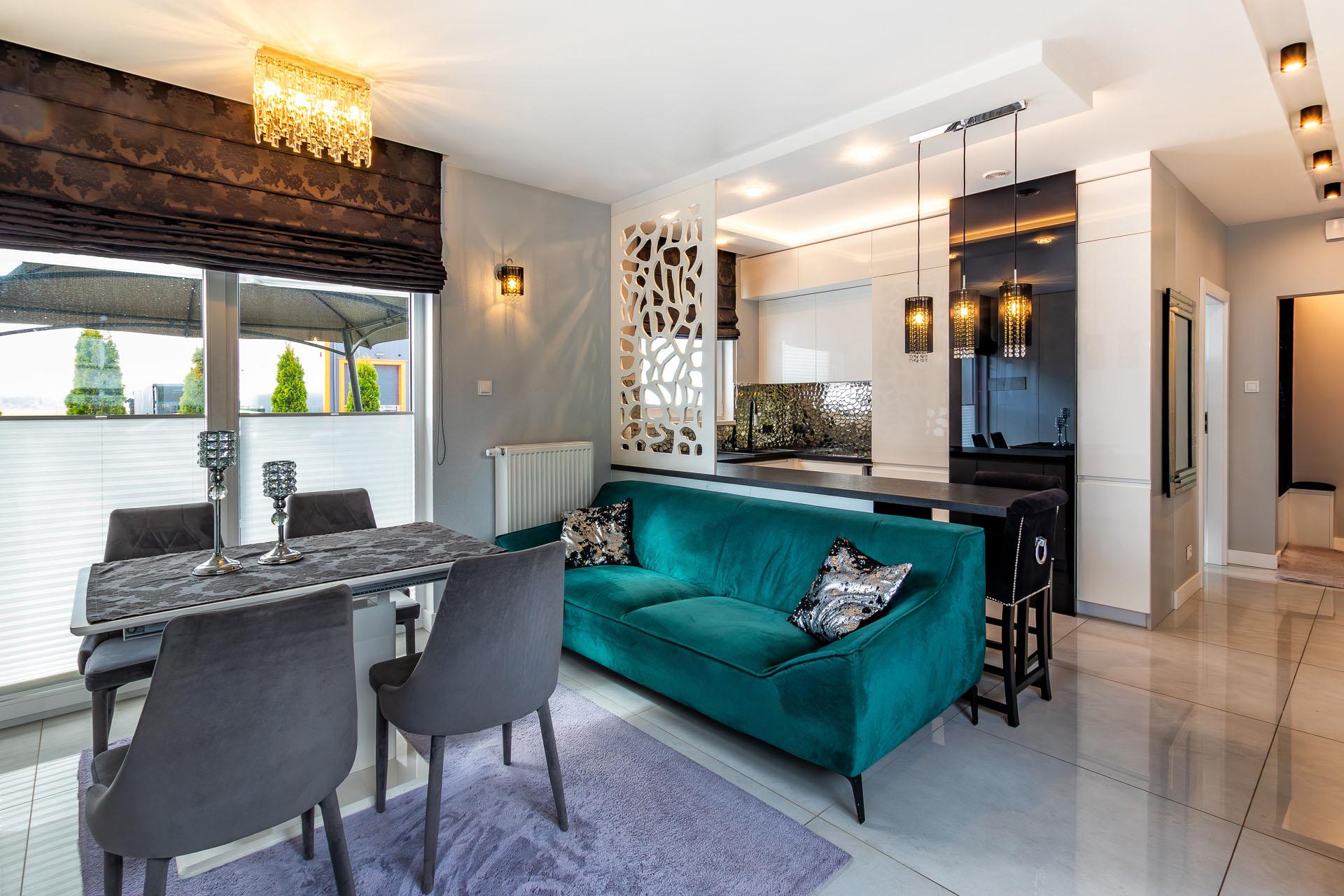 Widna kuchnia połączona z salonem w pełni wyposażona.