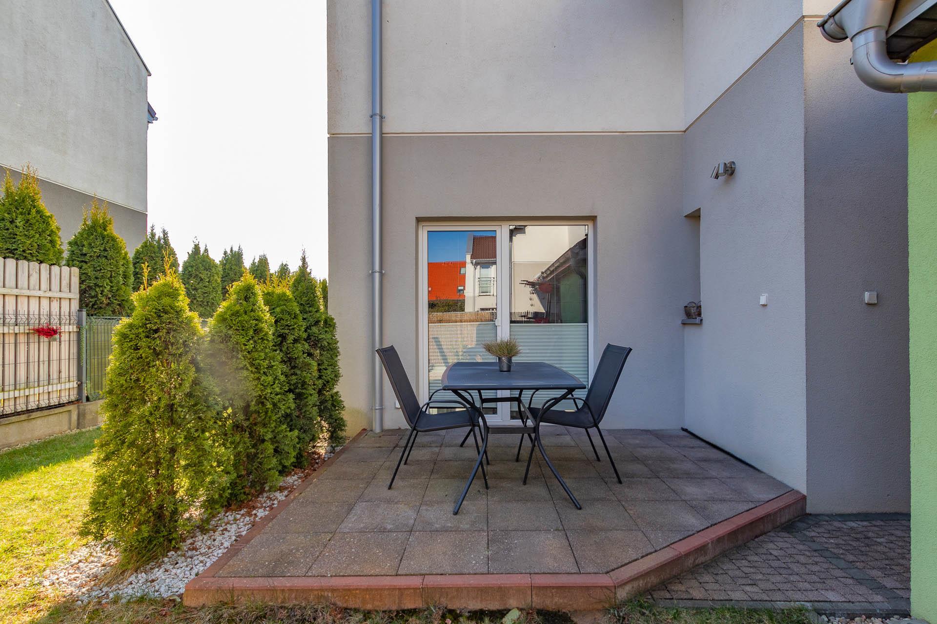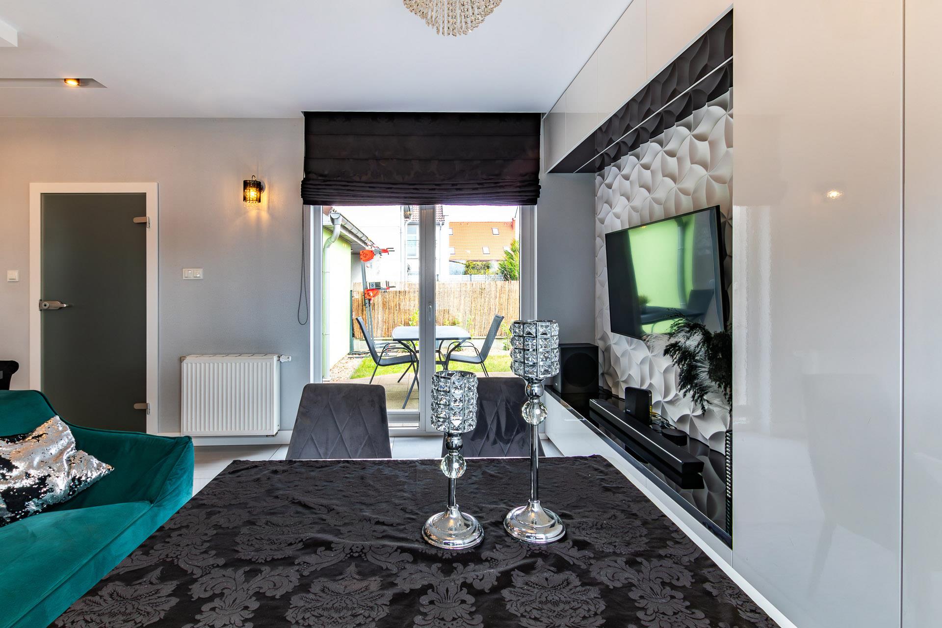 Na parterze pięknie urządzony salon z wyjściami na taras i zagospodarowaną ogrodzoną działkę.