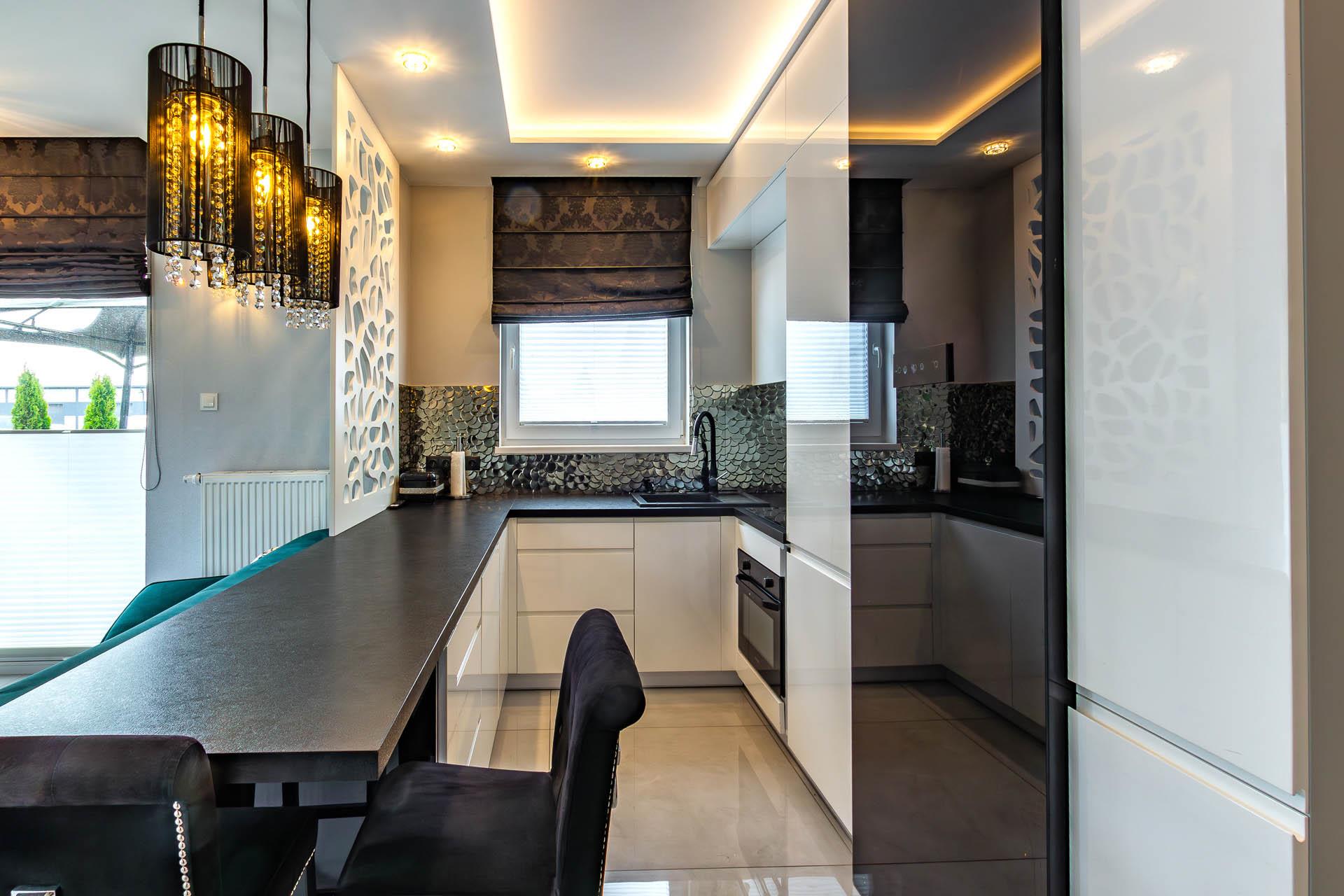 W cenie meble kuchenne w zabudowie z AGD (piekarnik, kuchenka indukcyjna, lodówka, zmywarka).