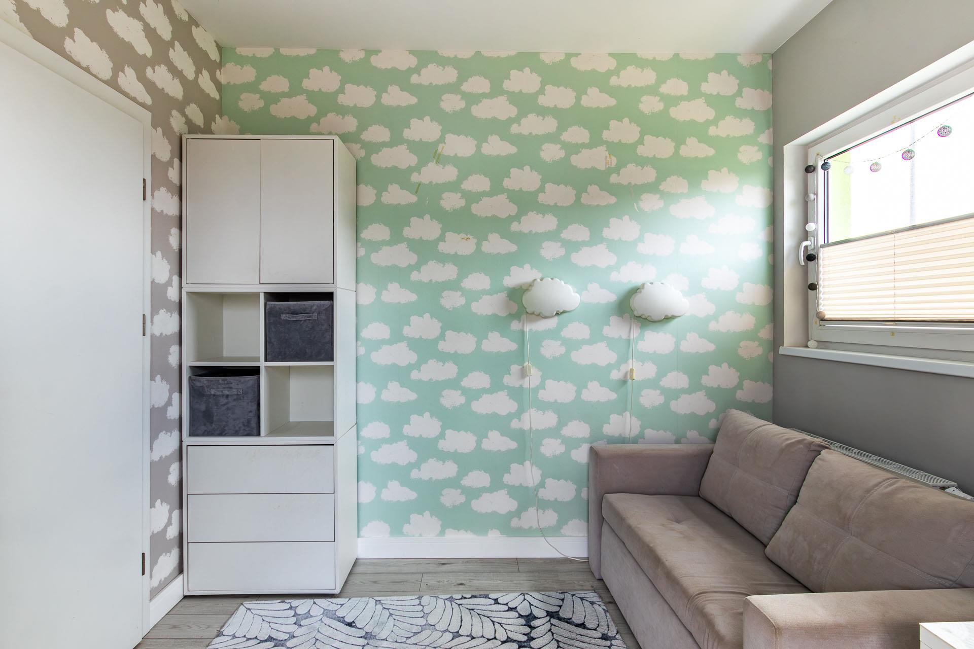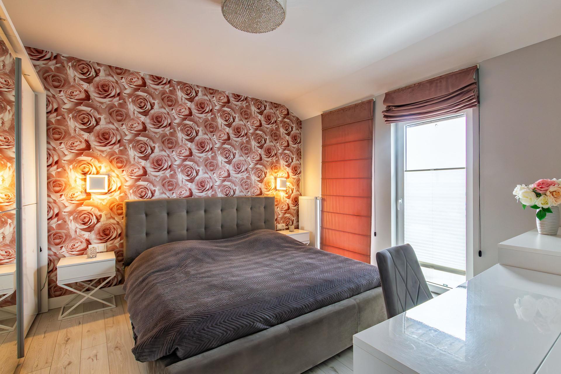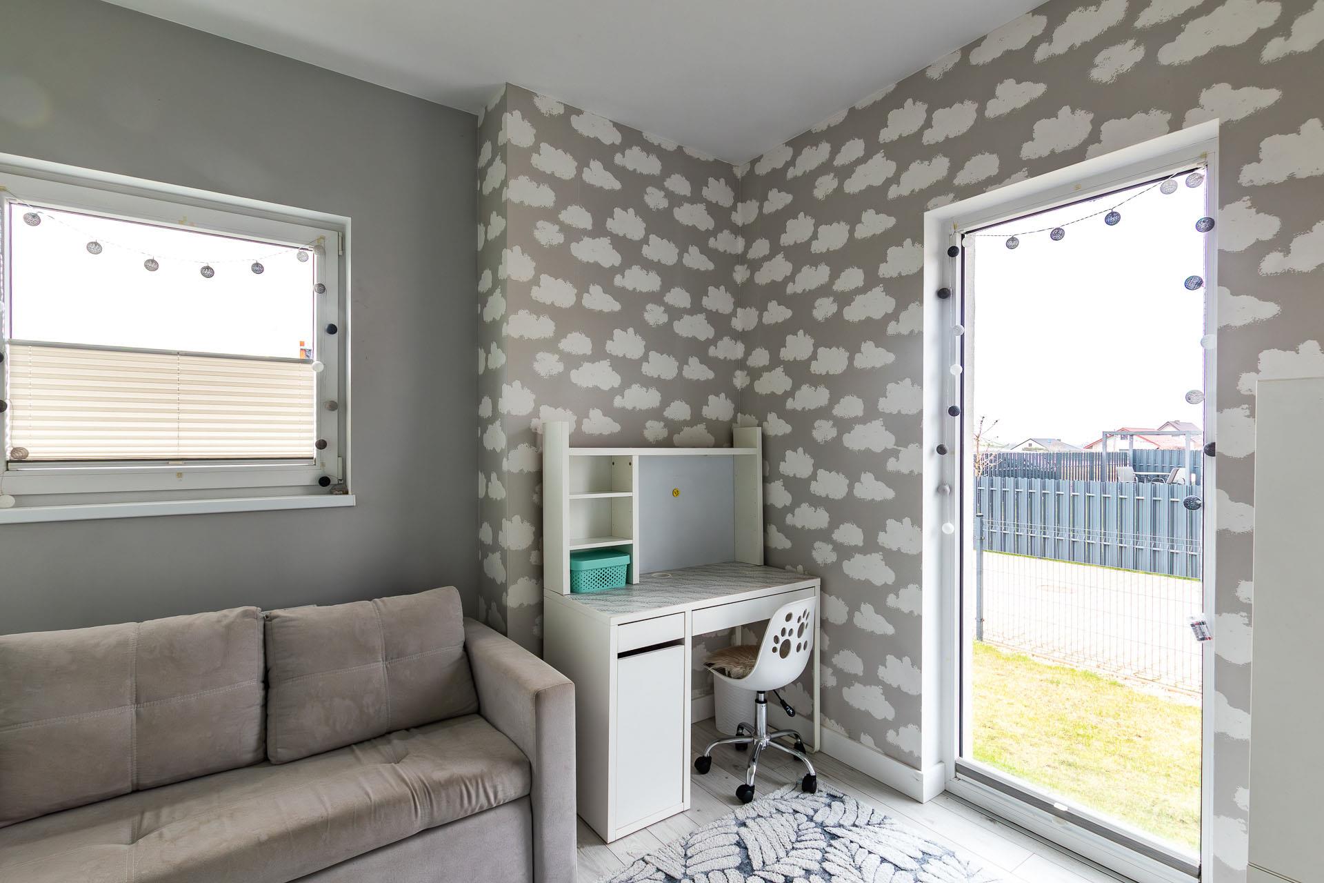 Jasna sypialnia z wejściem na działkę. Na podłodze panele, ściany gładź malowana i tapeta.