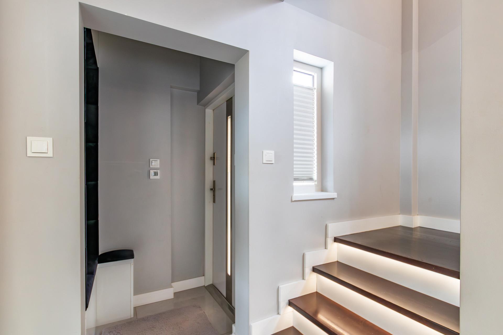 Na piętro prowadzą schody wykończone drewnem.