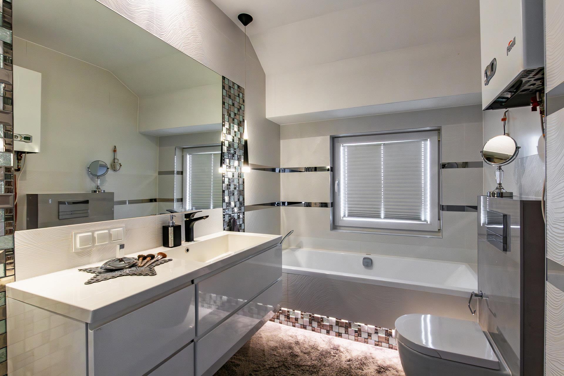 Pięknie oświetlona łazienka z oknem i wanną.