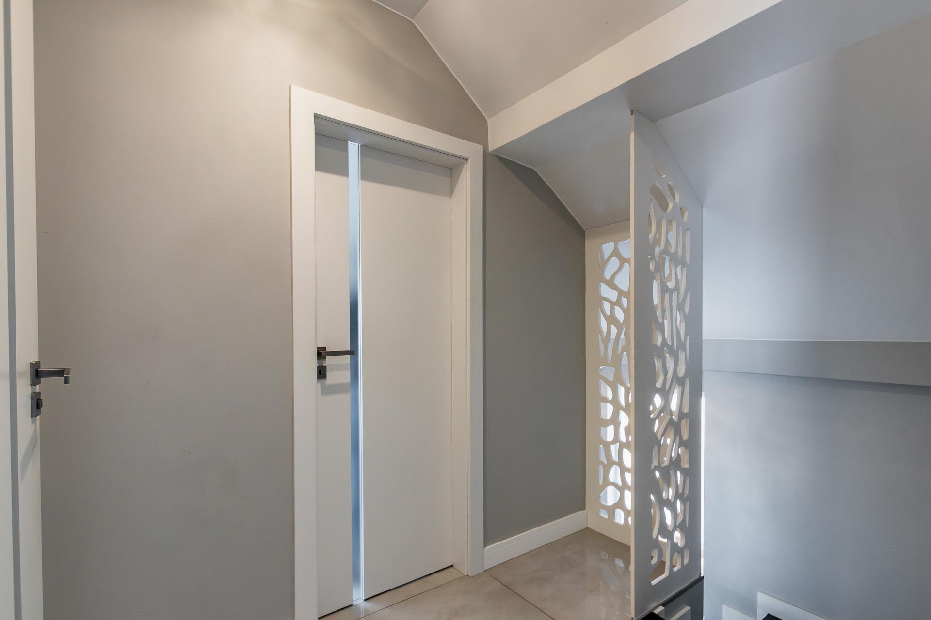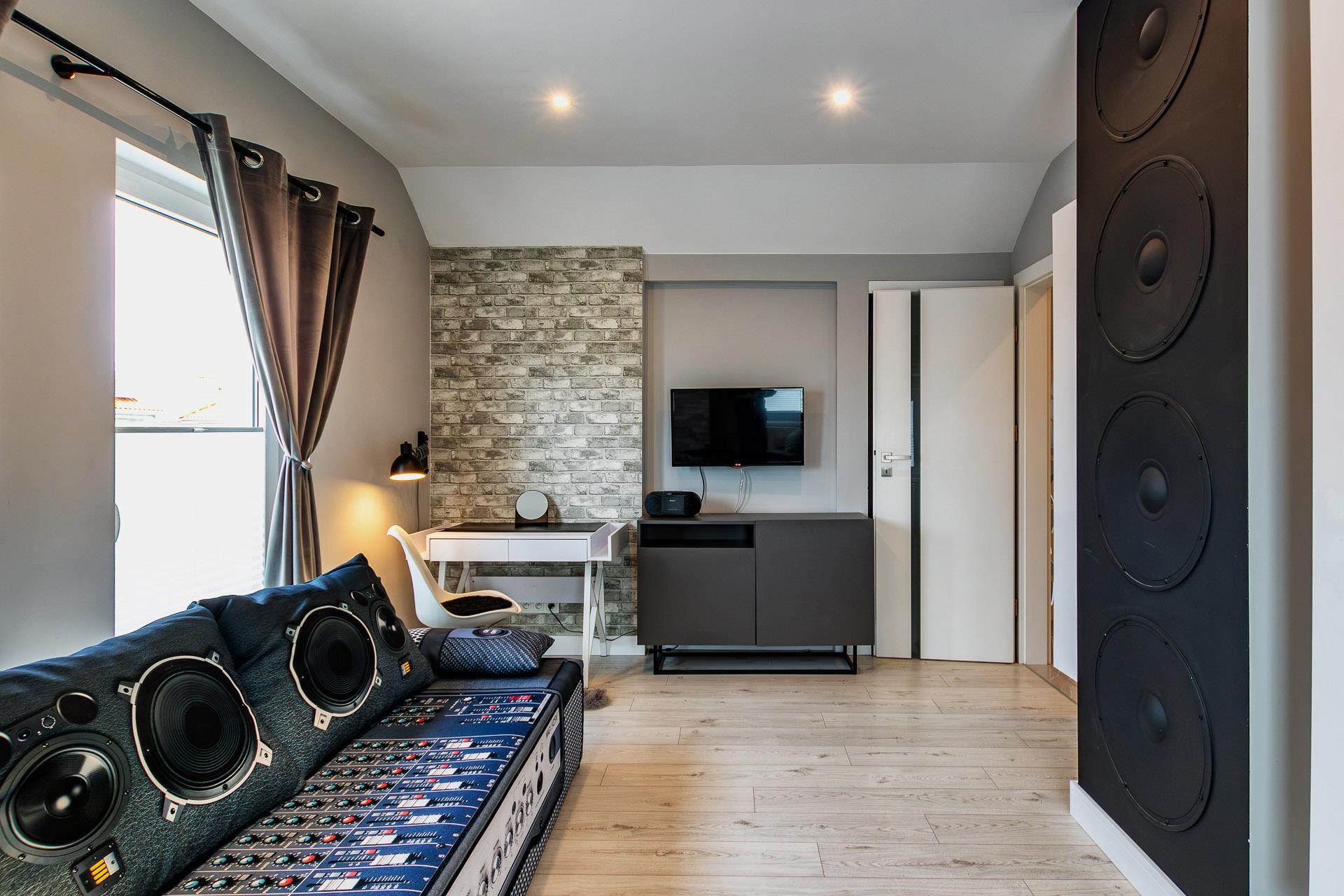 Na piętrze znajdują się dwa duże pokoje, w jednym z nich można urządzić przestronną garderobę.