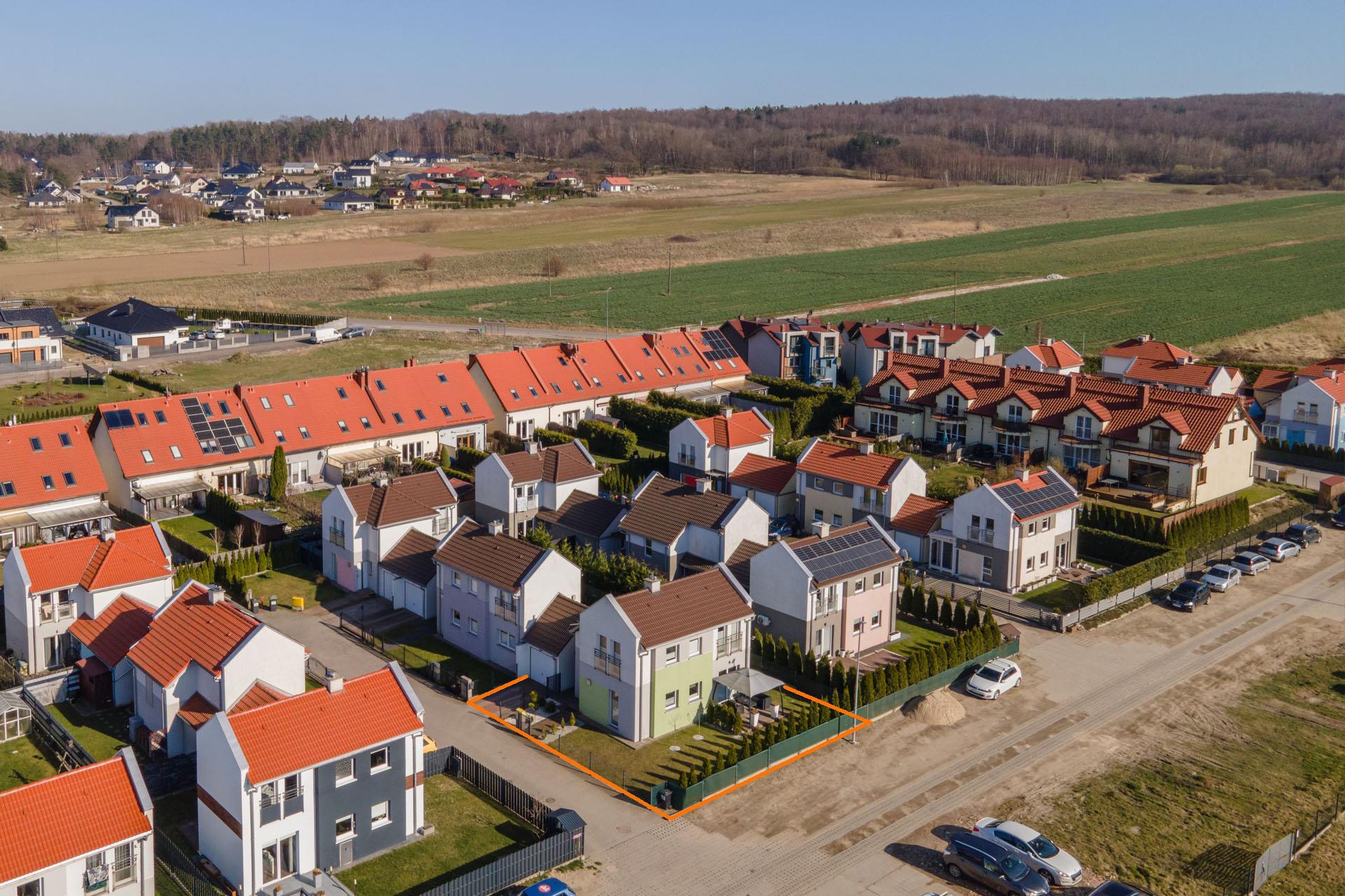 Spokojne osiedle domów jednorodzinnych. Wokół osiedla tereny zielone.
