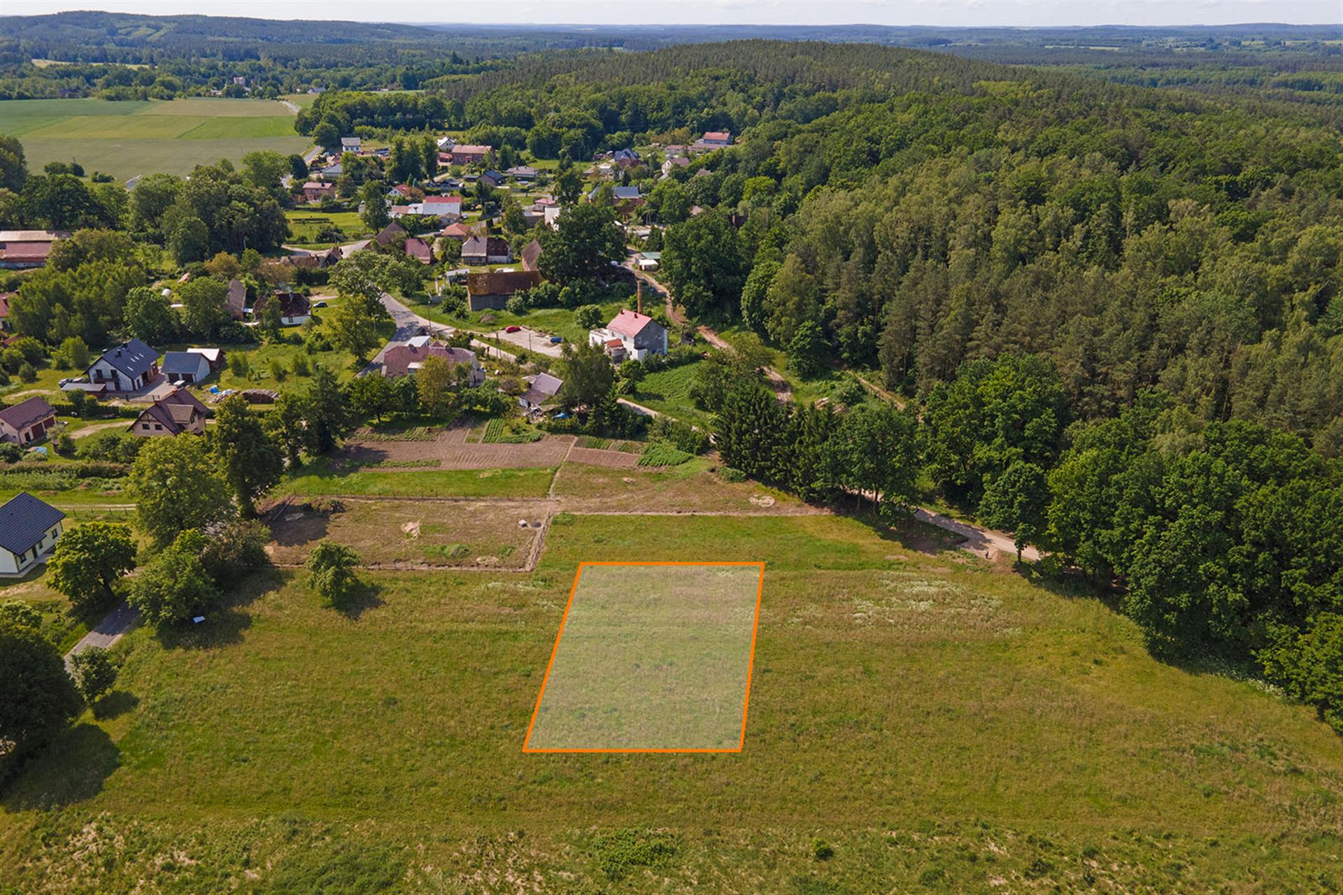 Działka niezabudowana położona w pobliżu nowych domów jednorodzinnych.