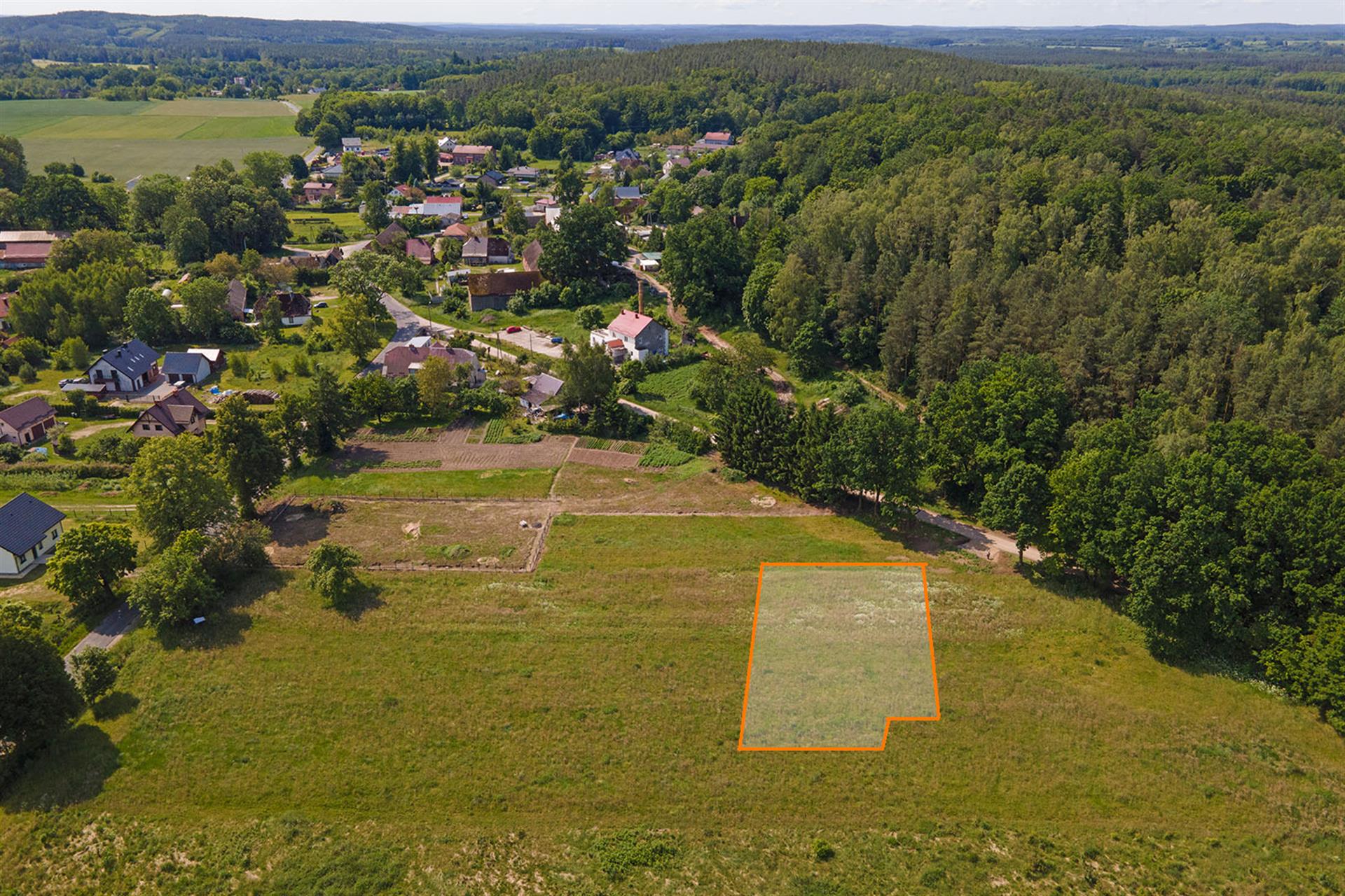 Działka niezabudowana położona w pobliżu nowych domów jednorodzinnych.