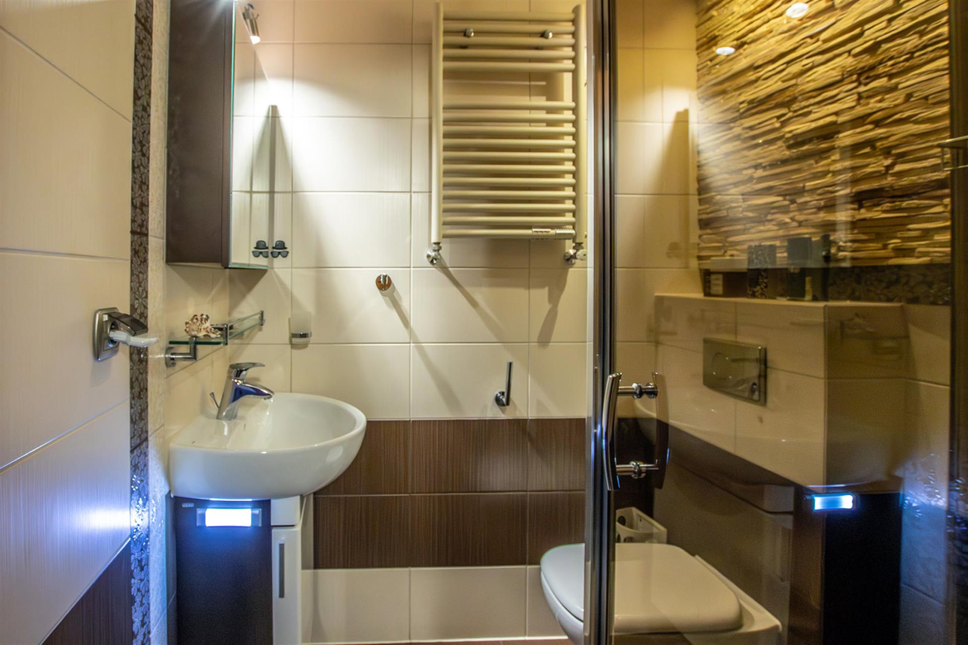 W pokojach panele podłogowe, w kuchni i łazienkach glazura i terakota.