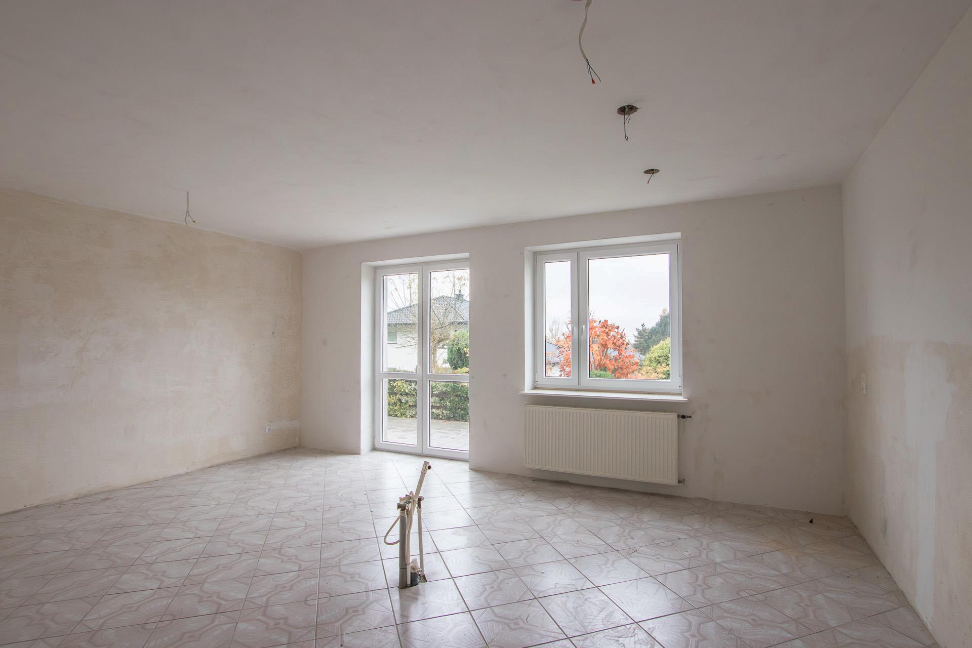 Okna PCV oraz drewniane, podłogi w kuchni z jadalnią - terakota, w pokojach wylewki cementowe, ściany tynki gipsowe.