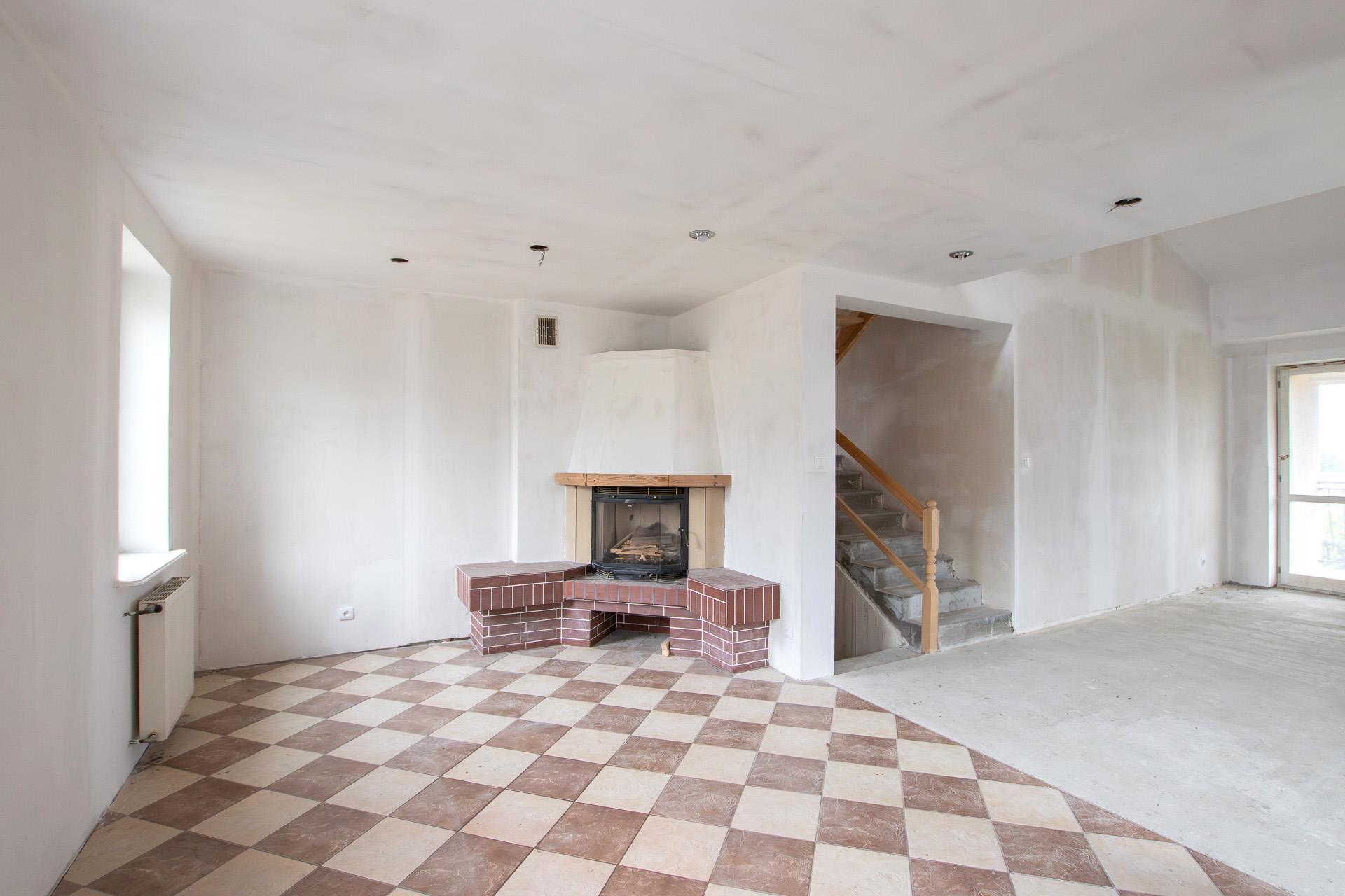 Ogrzewanie kominkowe w salonie z nawiewem na klatkę schodową i jeden pokój.
