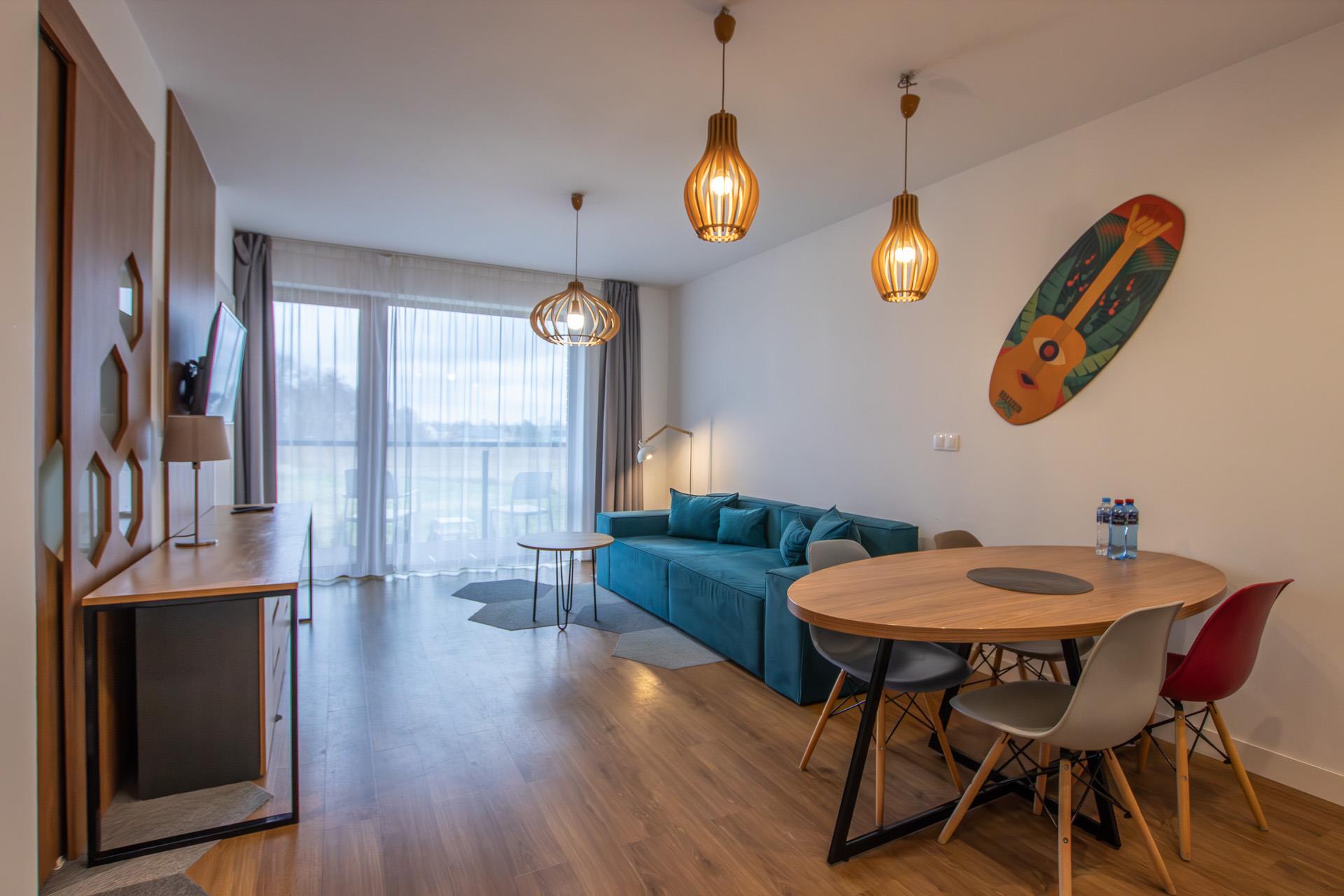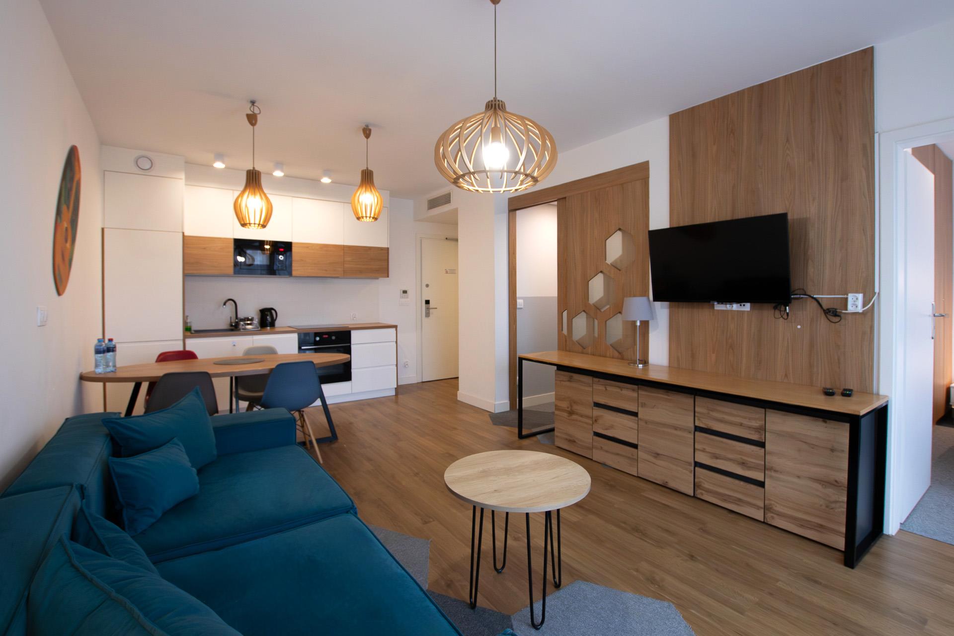 Apartament o wysokim standardzie wykończenia, kompletnie umeblowany i wyposażony.