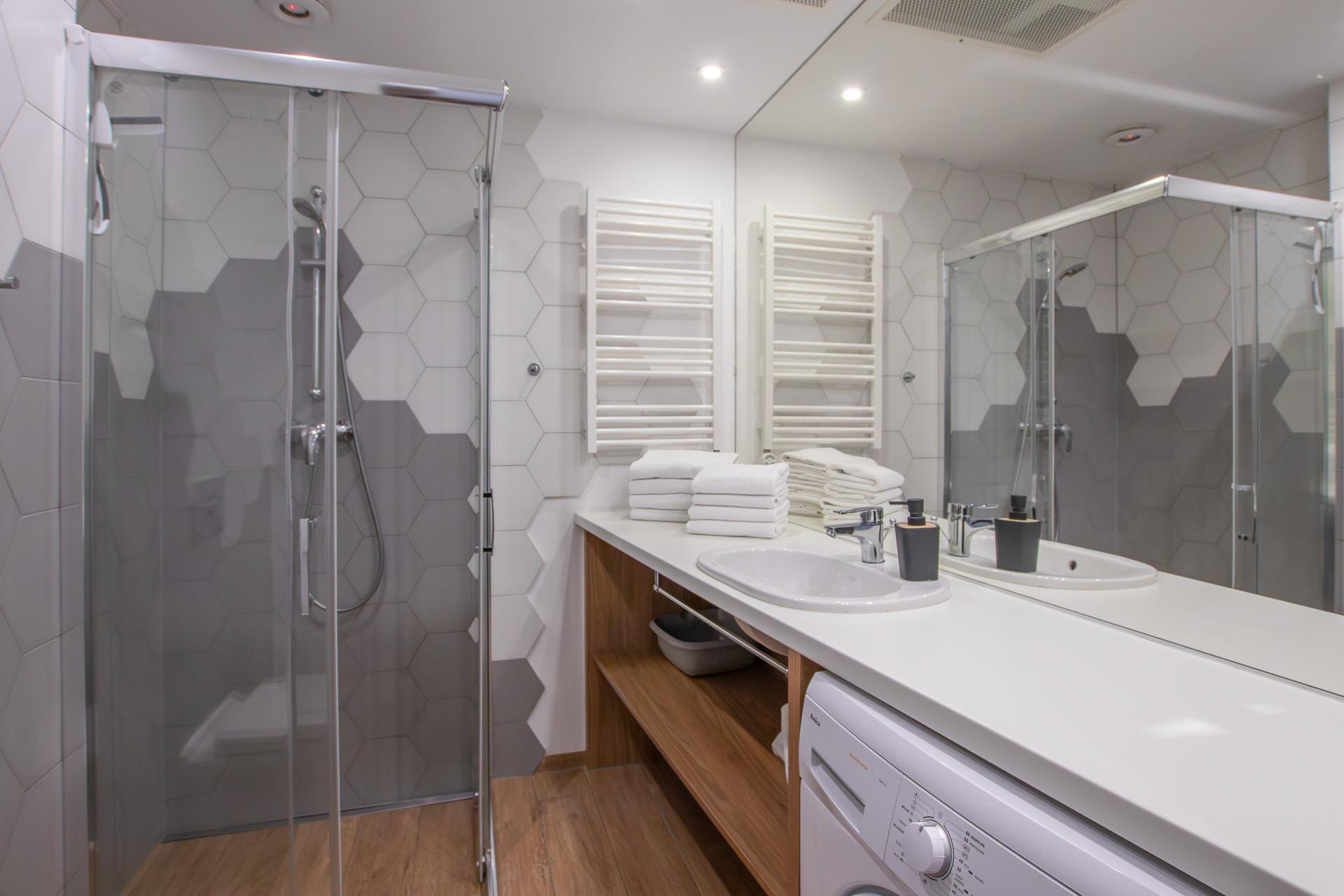 W łazience panele winylowe, glazura, kabina natryskowa, kompakt, pralka.