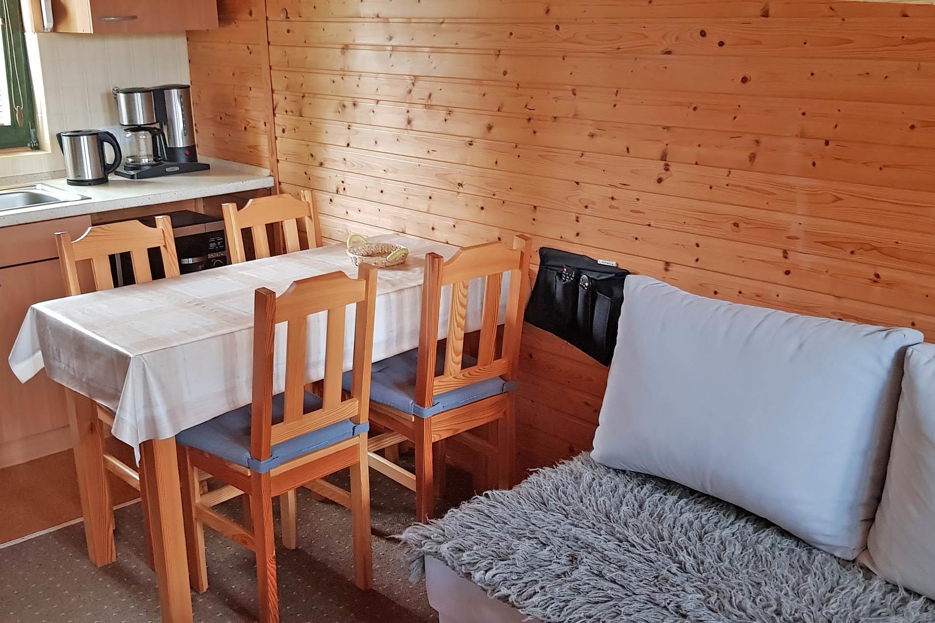 W cenie: umeblowanie i wyposażenie domków, zabudowa kuchenna, płyta ceramiczna, lodówka.