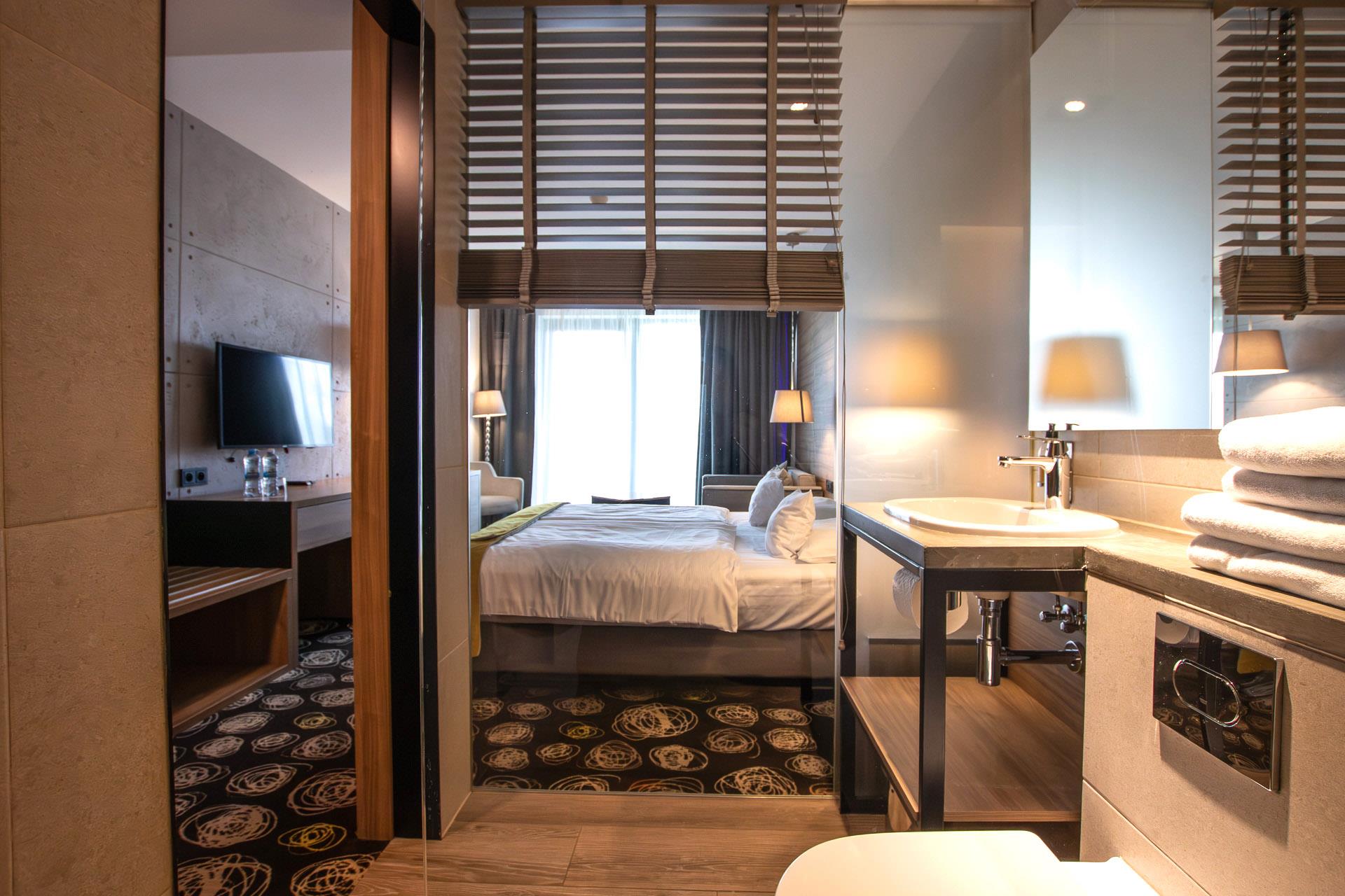 Apartament usytuowany na 1 piętrze w 2-kondygnacyjnym obiekcie hotelowym z restauracją.