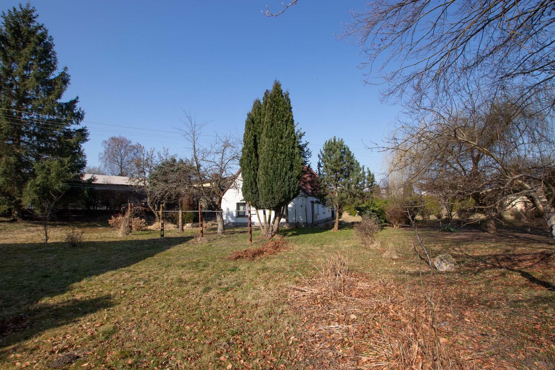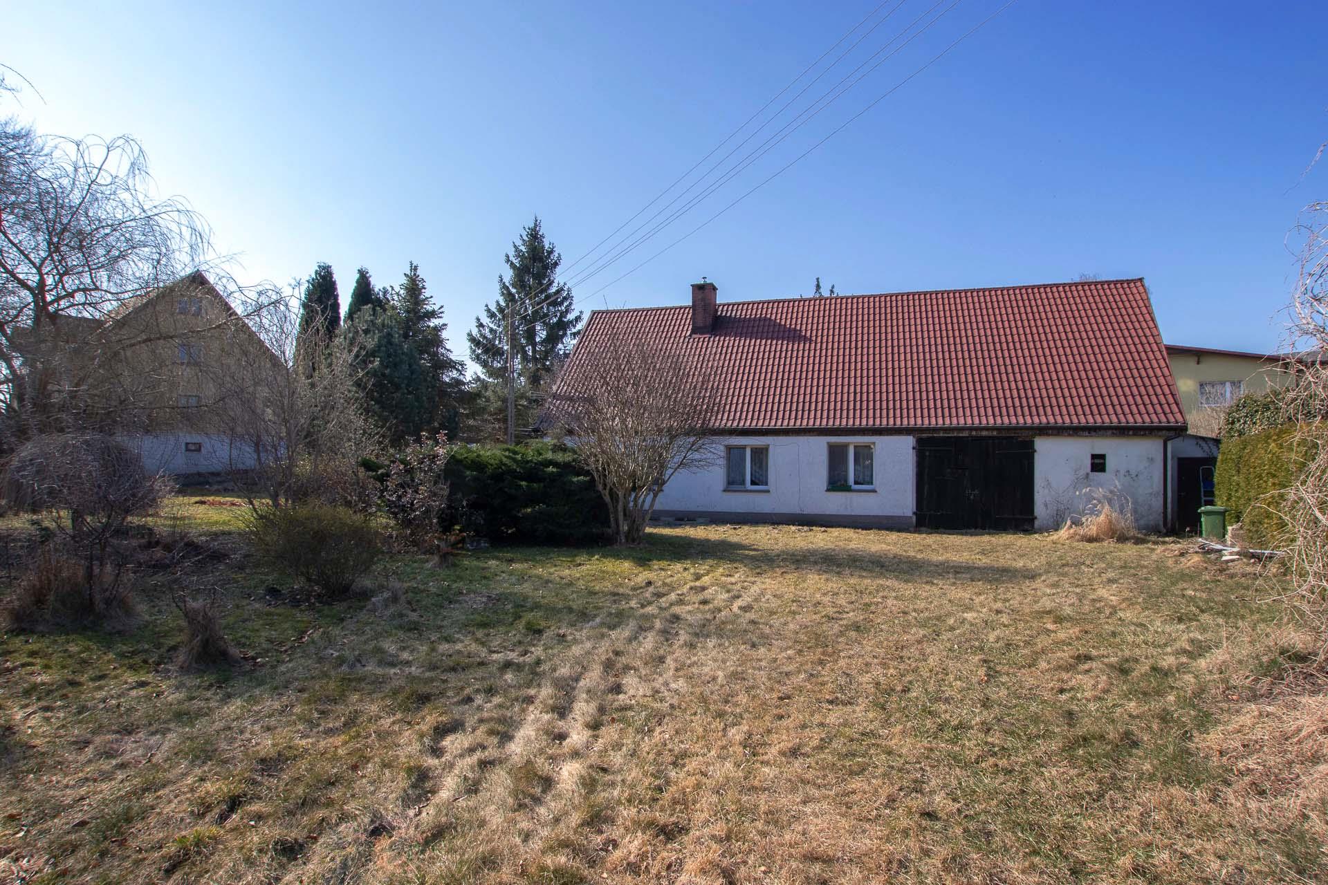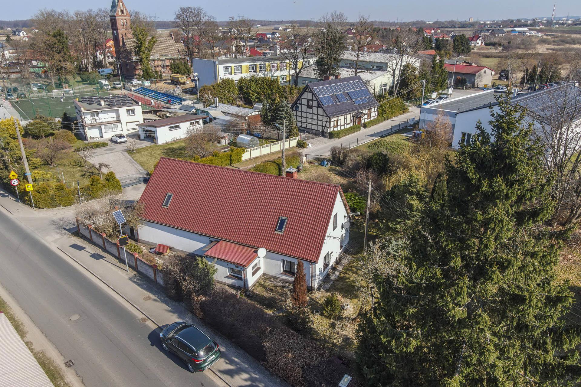 Nieruchomość zabudowana domem mieszkalnym z dwoma odrębnymi mieszkaniami oraz budynkiem gospodarczym.