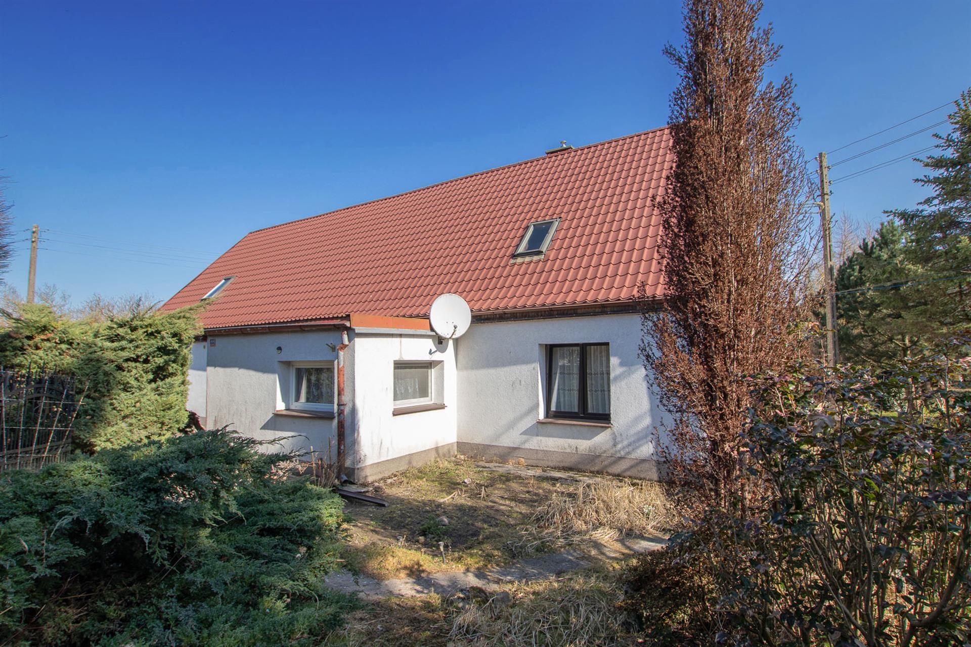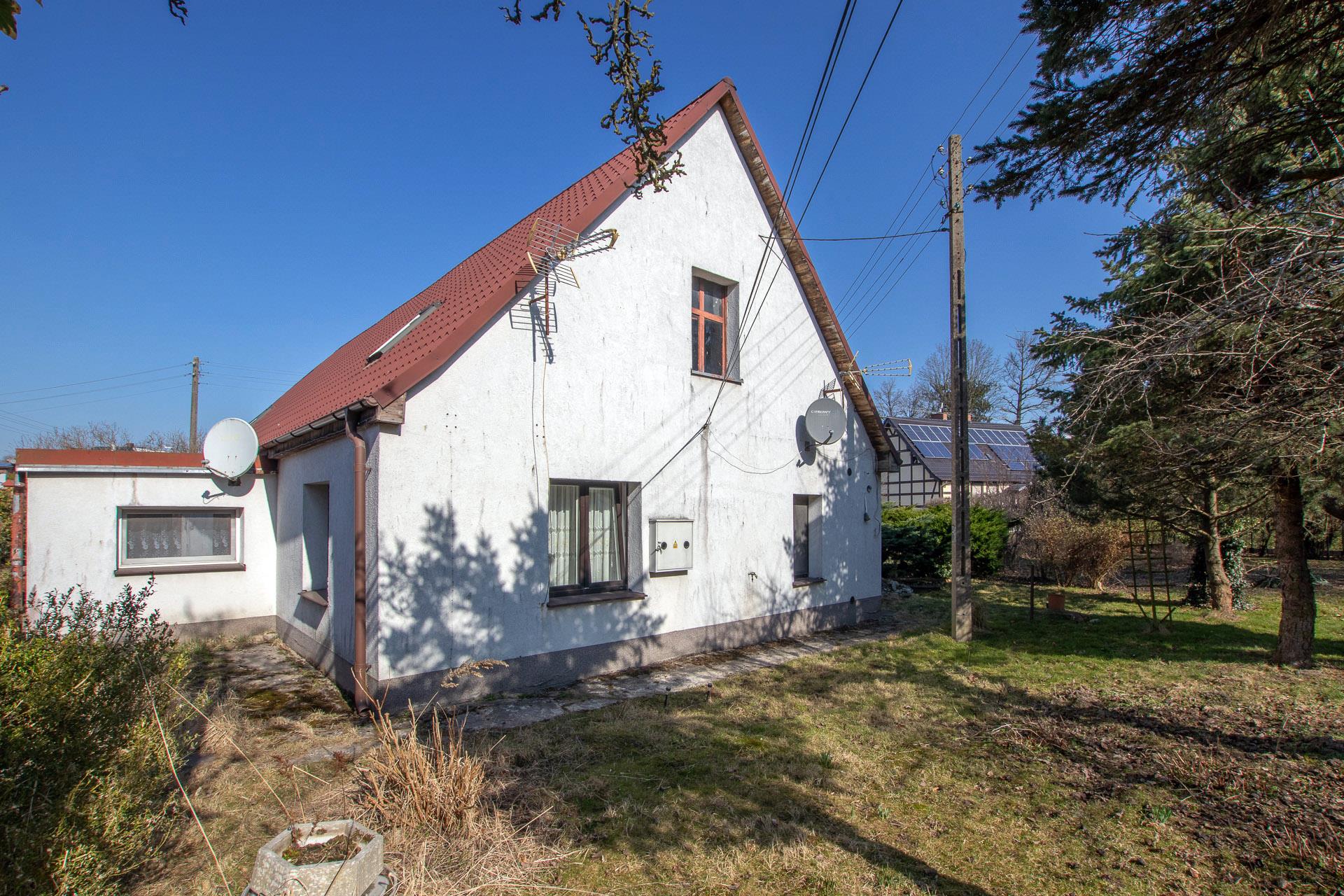 Dom przedwojenny, parterowy z poddaszem użytkowym, murowany, dach pokryty blachodachówką.