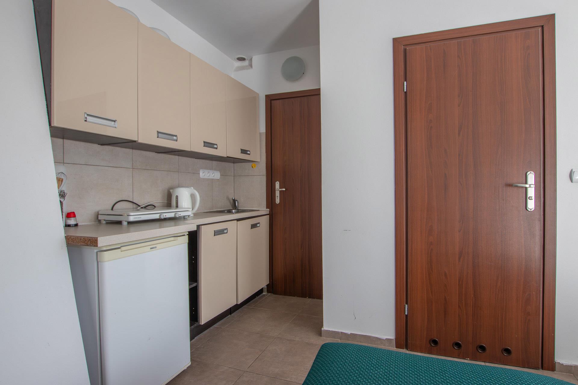 - apartament II: pokój z aneksem kuchennym i łazienką.