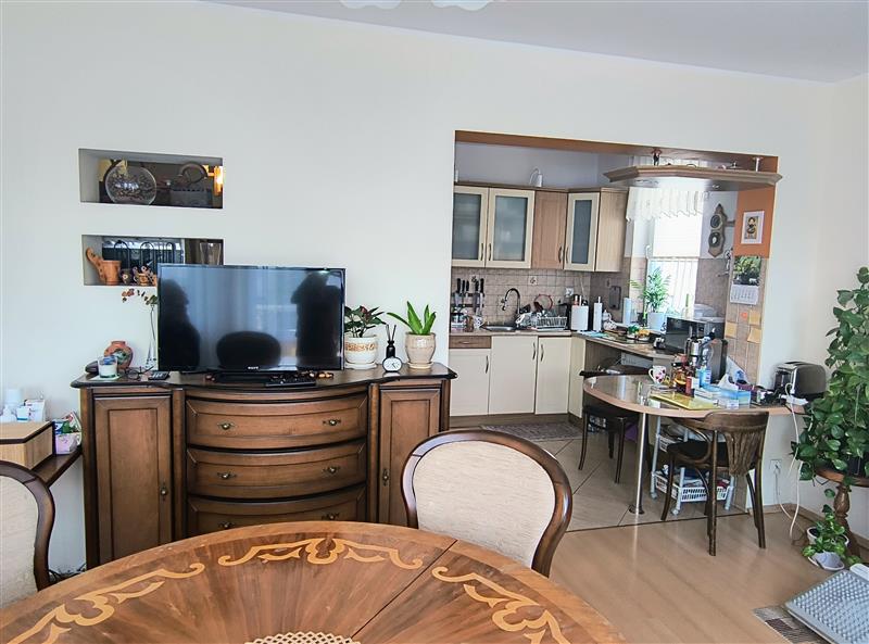 Salon słoneczny w wyjściem na balkon, połączony z aneksem kuchennym (można oddzielić).