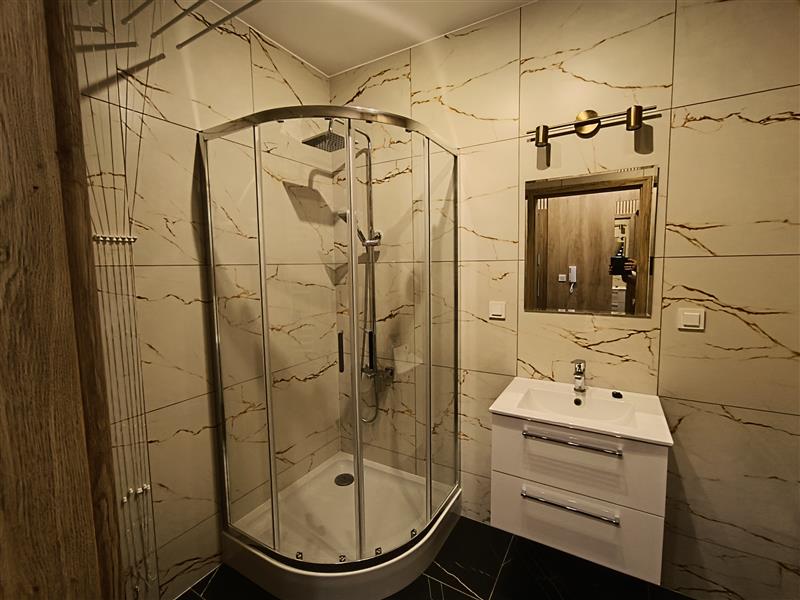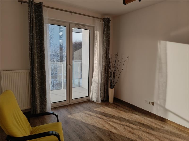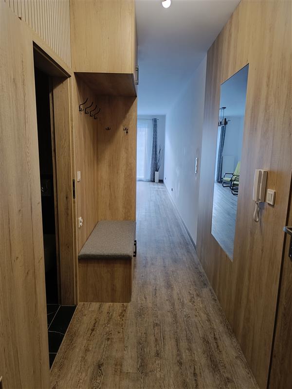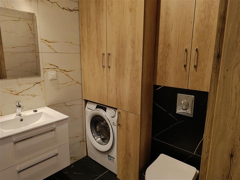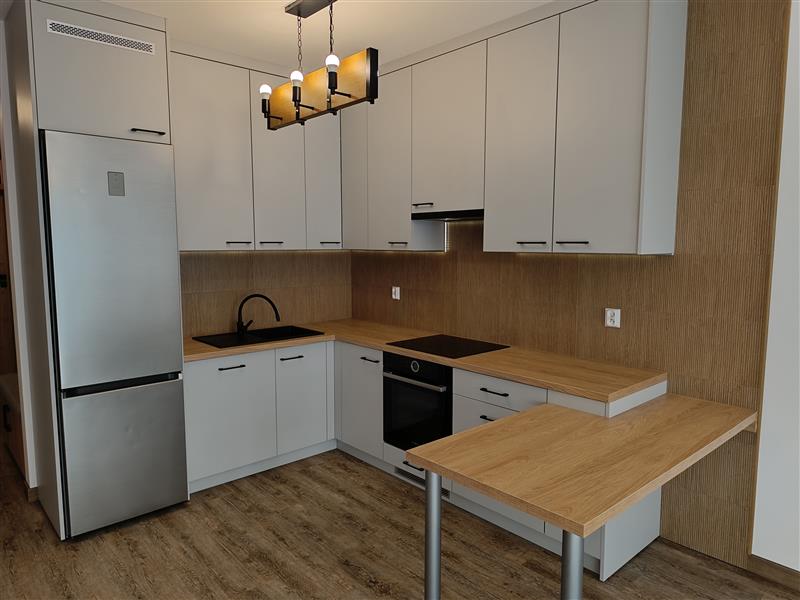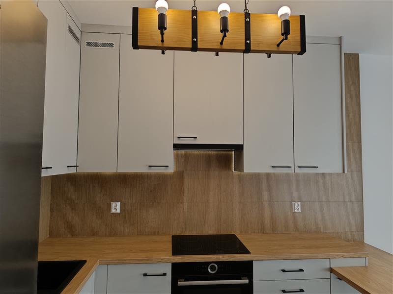 Dwa pokoje częściowo umeblowane w wysokim standardzie. Duża, wygodna łazienka, glazura i terakota w jasnej tonacji: pralka, kabina prysznicowa, wc typu Geberit, umywalka. Kuchnia otwarta na salon, nowe urządzenia; duża lodówka, zmywarka, okap, płyta indukcyjna, piekarnik, zlewozmywak, szafki robione na wymiar.