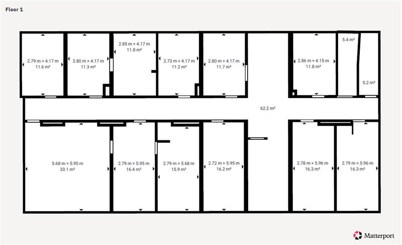 11 przestronnych pomieszczeń biurowych (od ok. 10 m2 do 32 m2),