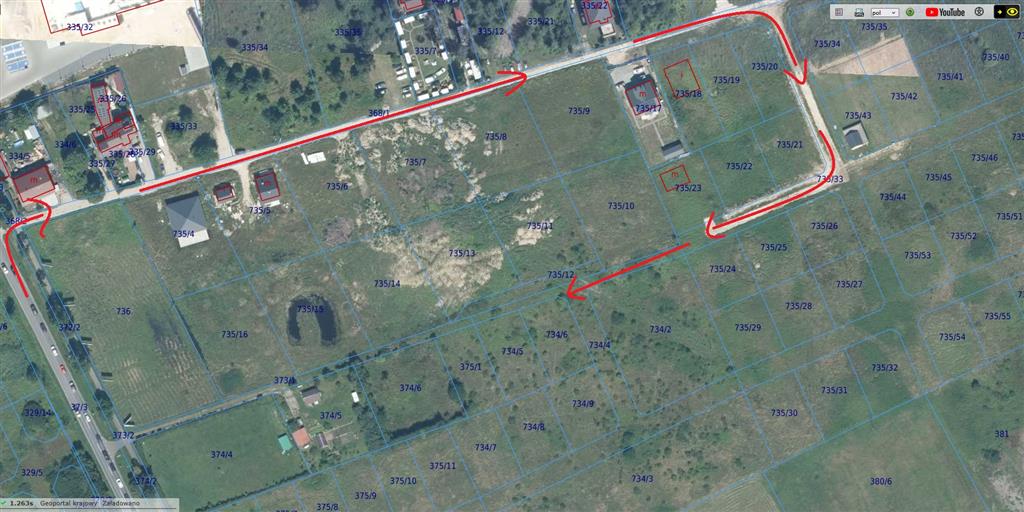 - lub przez ul. Zieloną przez około 370 metrów, następnie skręcić w prawo i znów w prawo utwardzoną drogą (w zdjęciach znajduje się mapka dojazdowa z czerwonymi strzałkami).