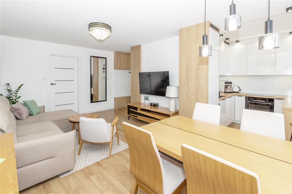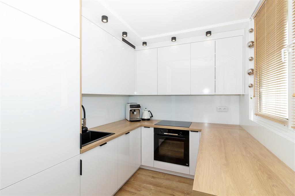 Kuchnię zaprojektowano pod wymiar i wyposażono w piekarnik, płytę, zmywarkę, lodówko-zamrażarkę, okap. W przedpokoju oraz w sypialni szafy w zabudowie. Okna PCV. W pomieszczeniach modne oświetlenie sufitowe.