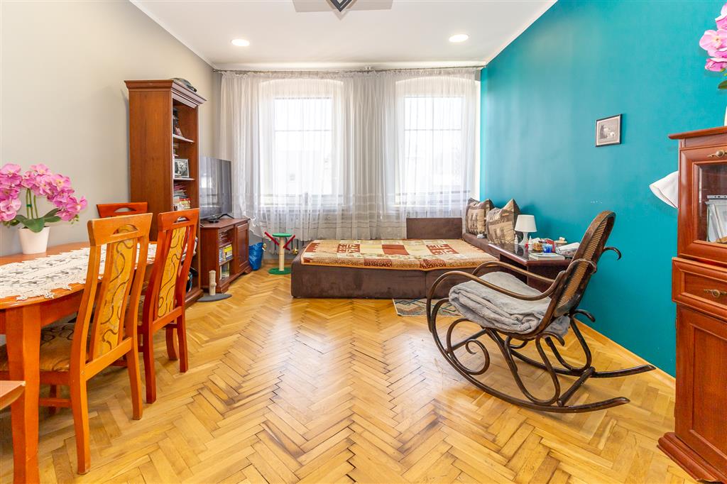 Okna PCV. W pokojach na podłodze parkiet, ściany gładź. Łazienka i kuchnia w terakocie i glazurze. Do mieszkania przynależy piwnica.
