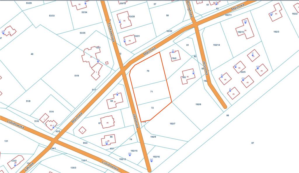 - Położenie: działka położona w rogu ulic Malinowej i Jagodowej na szybko rozwijającym się osiedlu domów 1-rodzinnych, w otoczeniu nowoczesne domy, Orlik, pętla autobusowa.