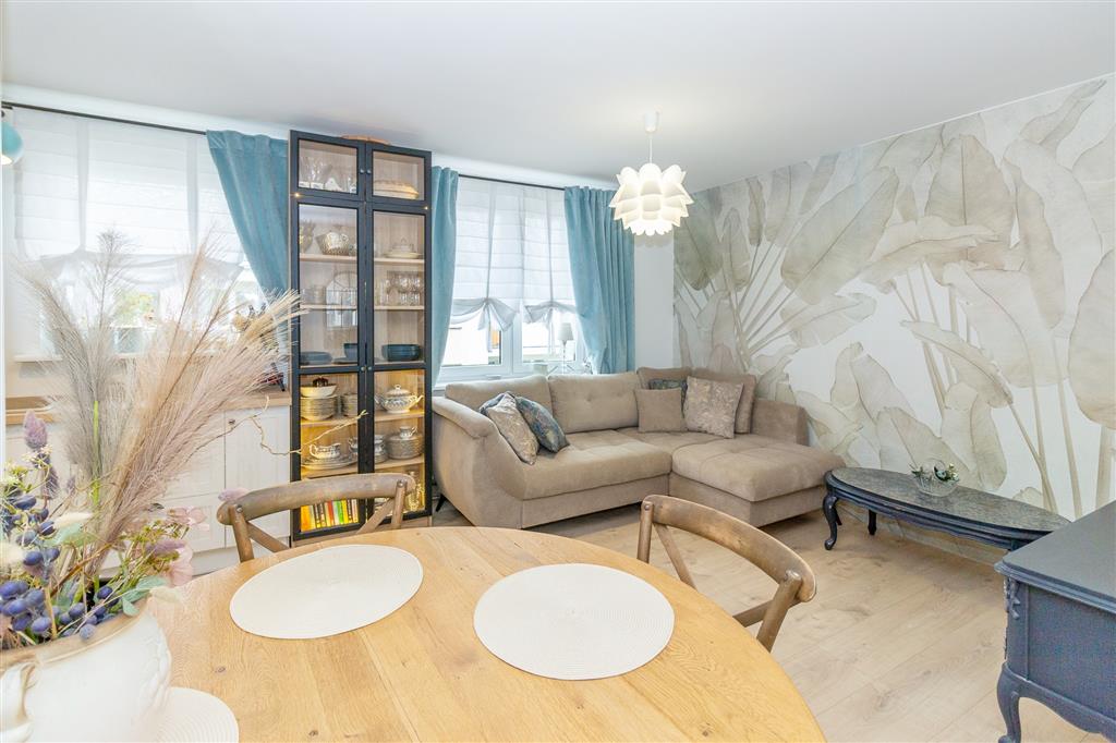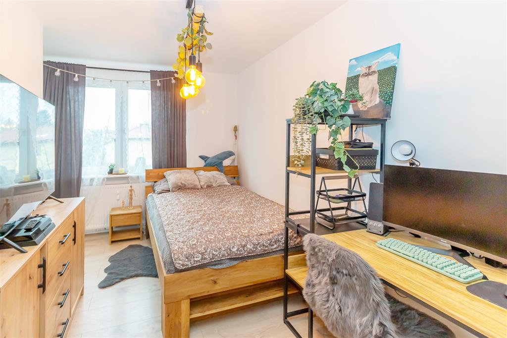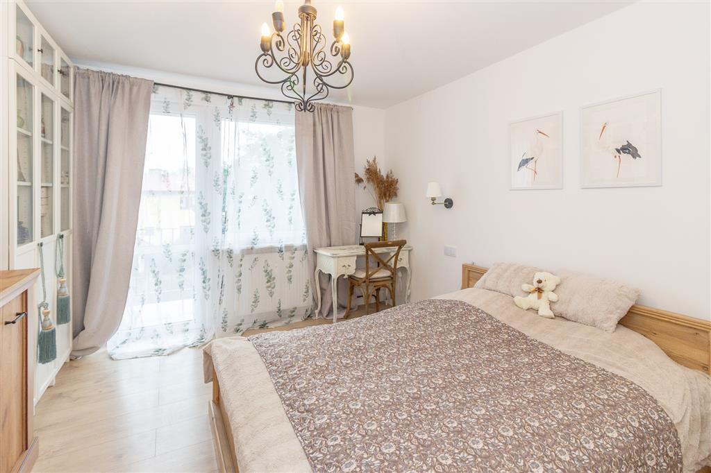 Przemyślany układ wnętrza sprawia, że mieszkanie jest niezwykle funkcjonalne. Jasny salon z aneksem kuchennym staje się naturalnym sercem domu – idealnym do wspólnego spędzania czasu. Trzy dodatkowe pokoje dają pełną swobodę aranżacji – jako sypialnie, pokój dziecięcy czy domowe biuro. Dwa z nich posiadają wyjście na loggię, gdzie można zacząć dzień przy kawie lub zakończyć go w ciszy, z widokiem na spokojną okolicę.