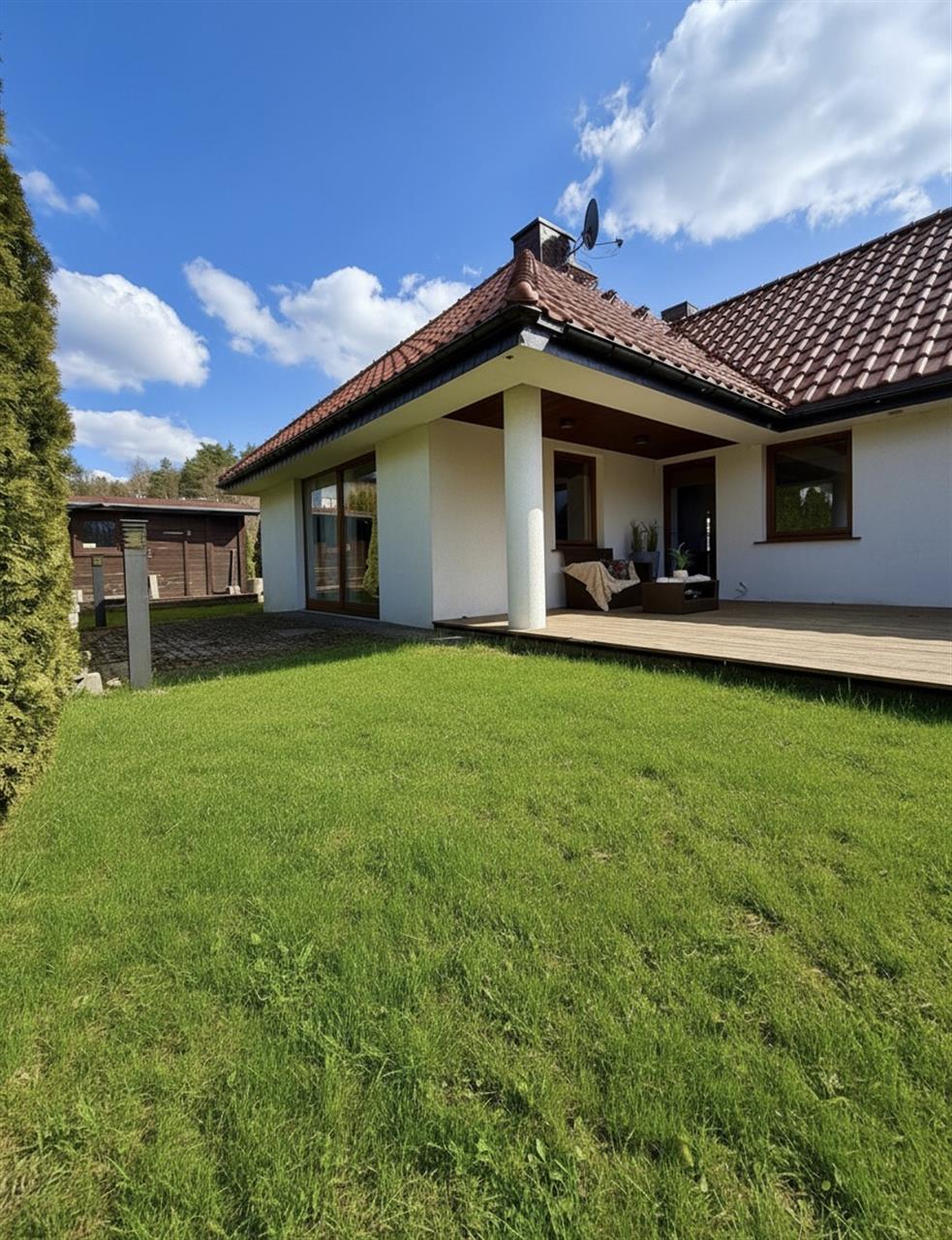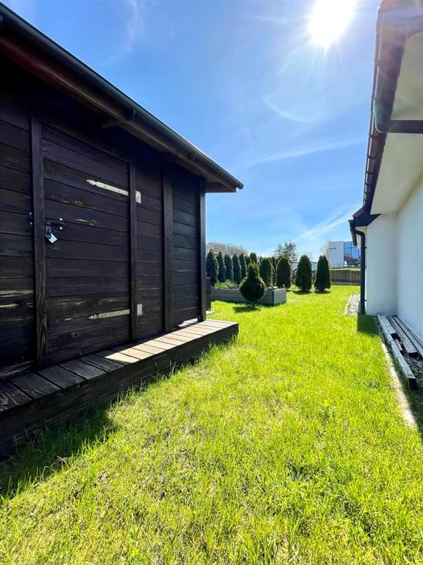 Dom oświetlony zewnętrznie (reflektory LED z czujkami zmierzchowymi). Na tarasie deska. Dodatkowo na posesji znajduję się niedawno wykonana drewniana wiata z miejscem przechowywania np. róźnych narzędzi.
