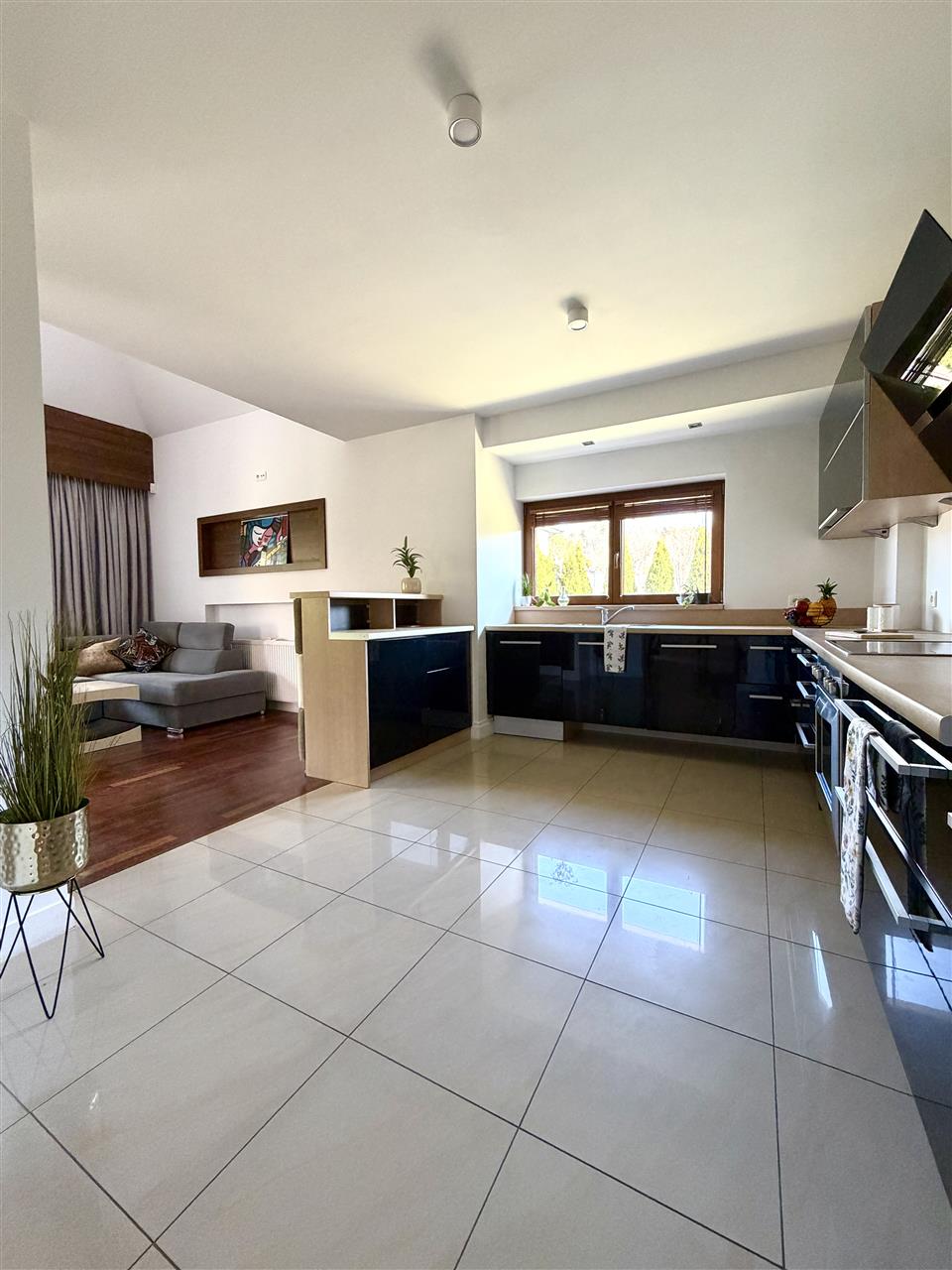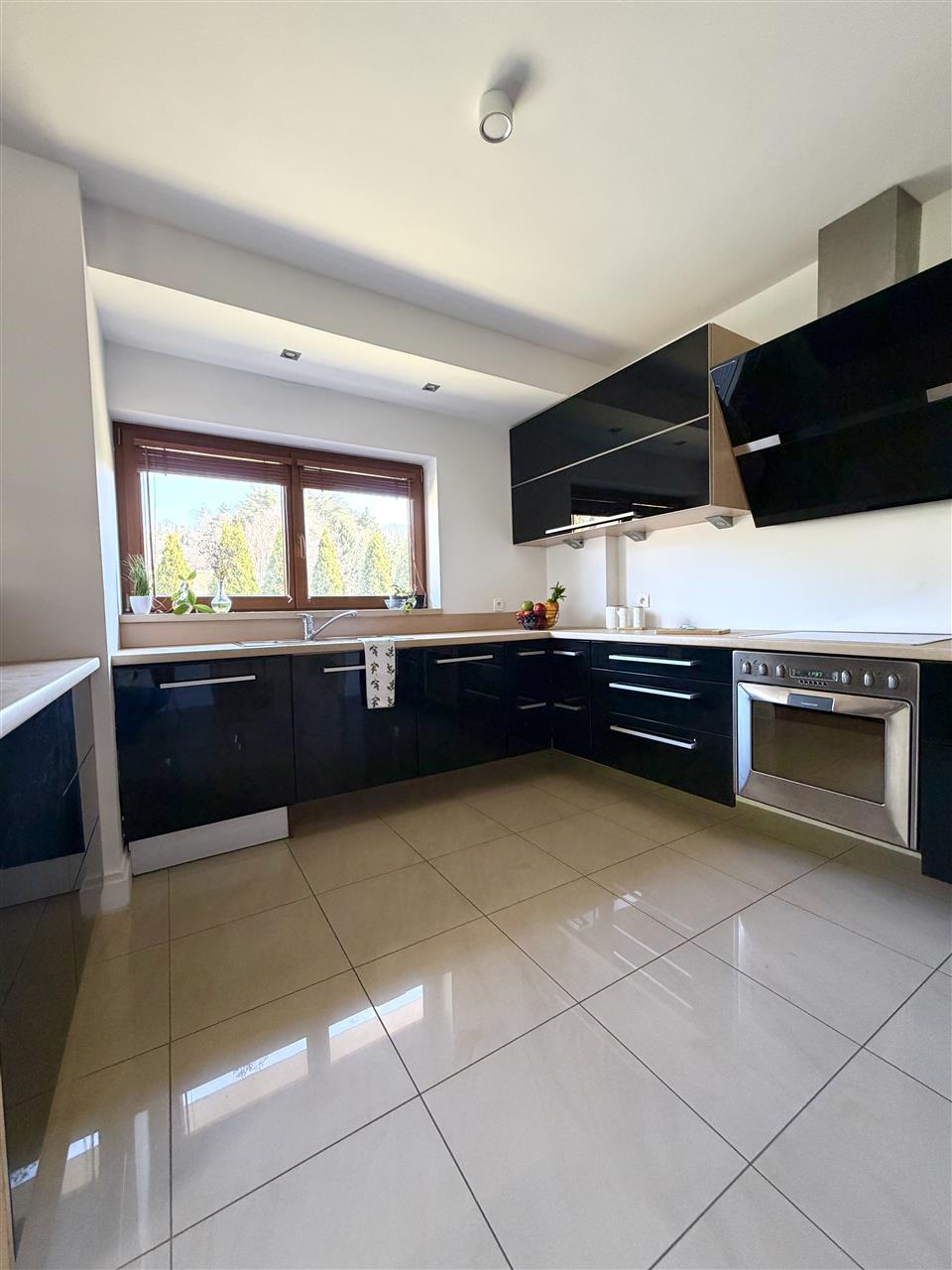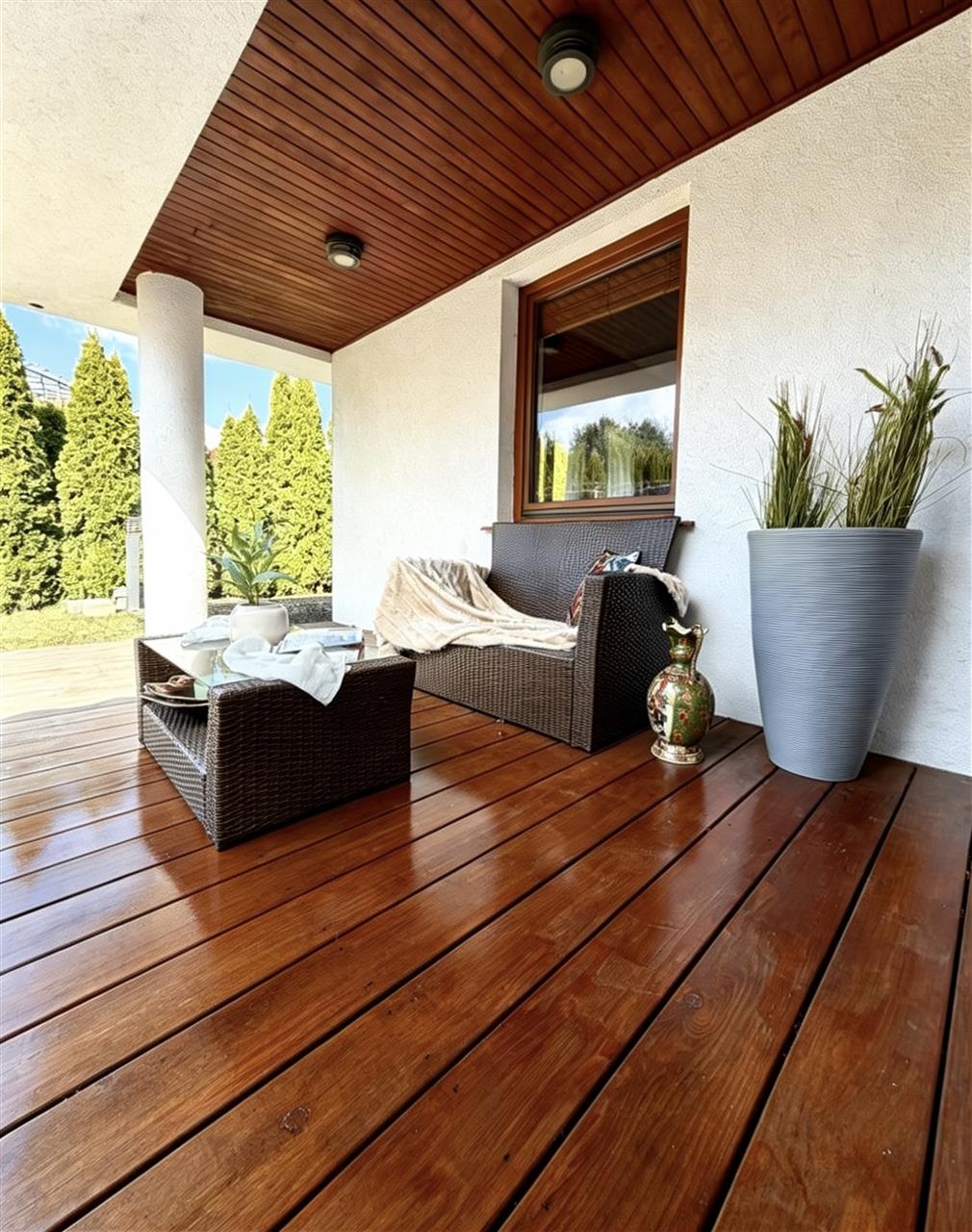 Dom wykończony w wysokim standardzie. Na podłogach w pokojach deska egzotyczna oraz panele, okna drewniane, zabudowa kuchenna wysokiej klasy. Schody drewniane z metalową balustradą. Eleganckie drzwi wewnętrzne z naturalnego drewna. Poza tym dom został wybudowany z materiałów budowlanych wysokiej jakości. Dachówka ceramiczna, okna drewniane meranti, tynki gipsowe, elewacja z tynku mineralnego. Na podjazdach i na ogrodzie oraz tarasach wykorzystano kostkę typu starobruk. Brama garażowa na pilota. Instalacje wewnętrzne: wod- kan, gazowa, energetyczna, kominkowa (komin ceramiczny), alarmowa, domofon. Ogrzewanie gazowe. W kotłowni piec gazowy dwufunkcyjny z 150L. zasobnikiem wody.