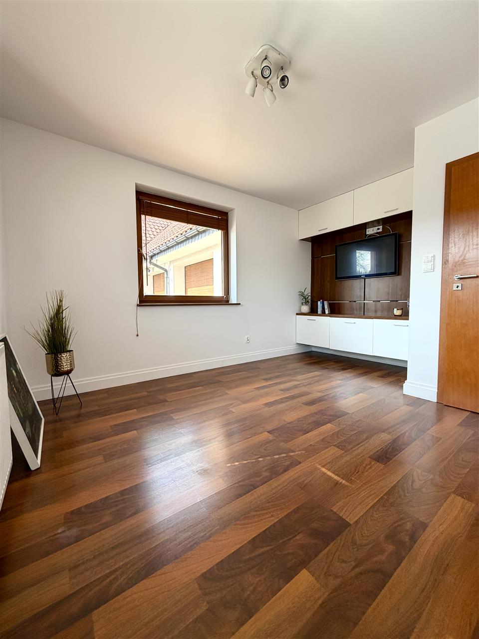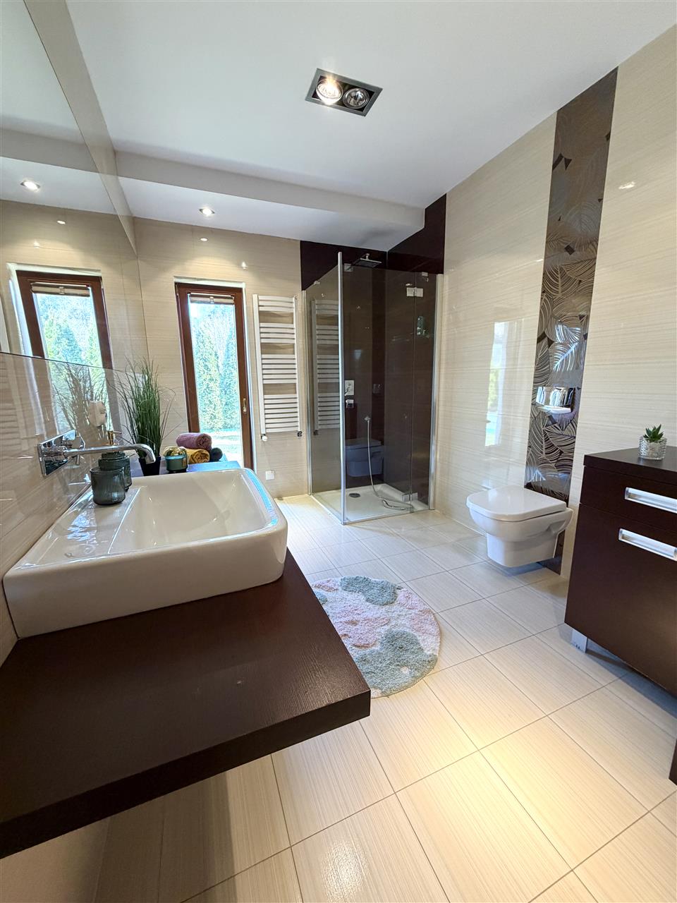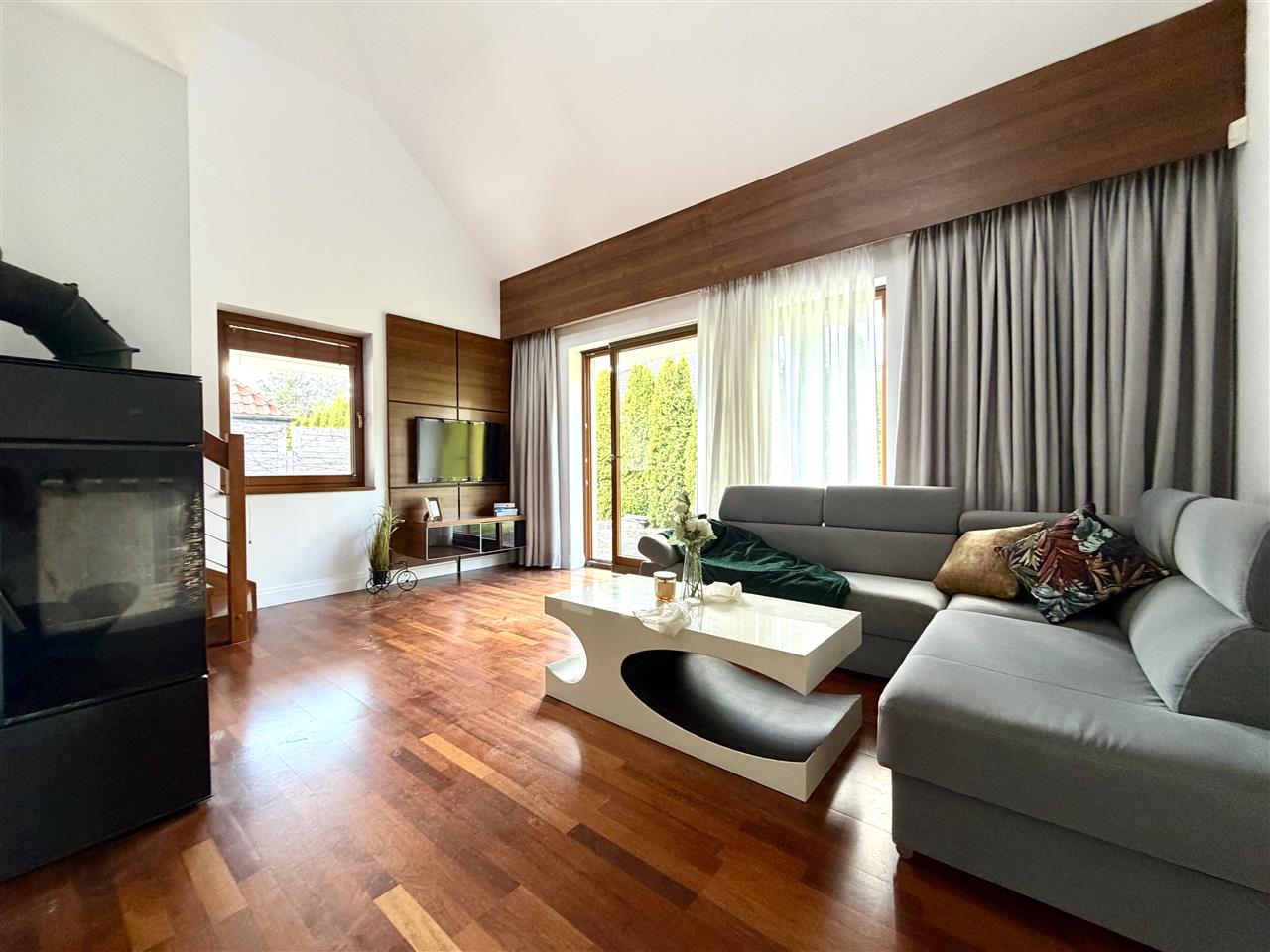 Dom wykończony w wysokim standardzie. Na podłogach w pokojach deska egzotyczna oraz panele, okna drewniane, zabudowa kuchenna wysokiej klasy. Schody drewniane z metalową balustradą. Eleganckie drzwi wewnętrzne z naturalnego drewna. Poza tym dom został wybudowany z materiałów budowlanych wysokiej jakości. Dachówka ceramiczna, okna drewniane meranti, tynki gipsowe, elewacja z tynku mineralnego. Na podjazdach i na ogrodzie oraz tarasach wykorzystano kostkę typu starobruk. Brama garażowa na pilota. Instalacje wewnętrzne: wod- kan, gazowa, energetyczna, kominkowa (komin ceramiczny), alarmowa, domofon. Ogrzewanie gazowe. W kotłowni piec gazowy dwufunkcyjny z 150L. zasobnikiem wody.