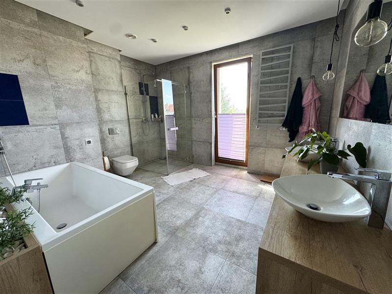 Duża łazienka główna o pow. 12,5 m2 – z oknem oraz wyjściem na balkon z zamontowaną zarówno wanną jak i prysznicem.