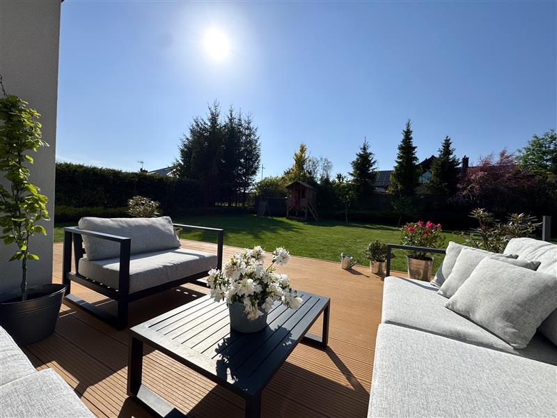 Dom został świetnie usytuowany względem stron świata – salon oraz taras mają ekspozycję południowo-zachodnią, co zapewnia naturalne światło przez cały dzień, aż do zachodu słońca.Taras i część ogrodowa są słoneczne od rana aż do zachodu słońca, co czyni to miejsce idealnym na odpoczynek, relaks i letnie spotkania.