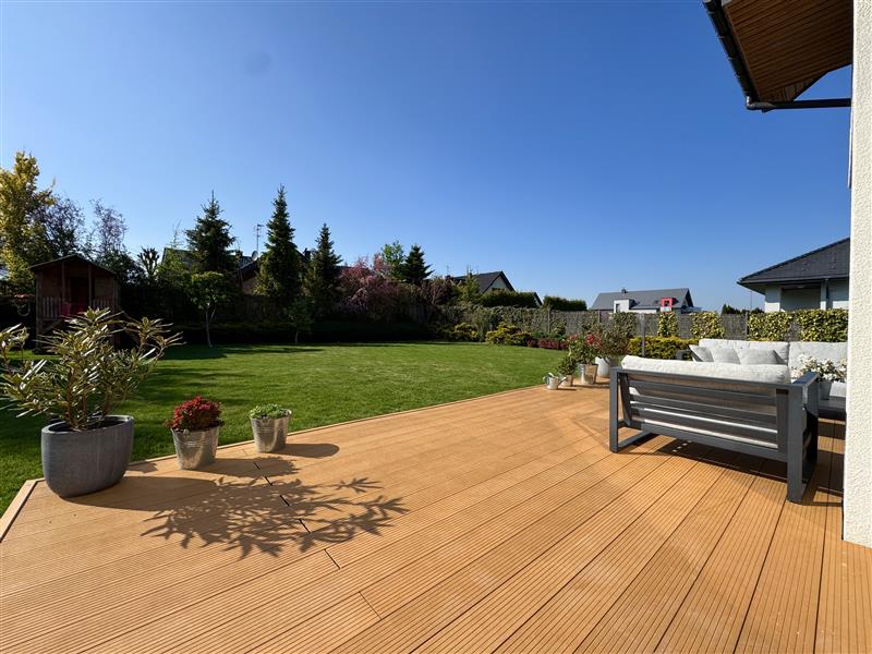 Działka o powierzchni 900 m2 stanowi idealne dopełnienie tej wyjątkowej nieruchomości. Zadbany ogród zachwyca starannie zaplanowaną roślinnością i różnorodnymi nasadzeniami, które nadają przestrzeni charakteru i uroku przez cały sezon. Trawnik z rolki jest w doskonałym stanie – gęsty, soczyście zielony i perfekcyjnie utrzymany, tworzy elegancką przestrzeń do wypoczynku i rekreacji.
