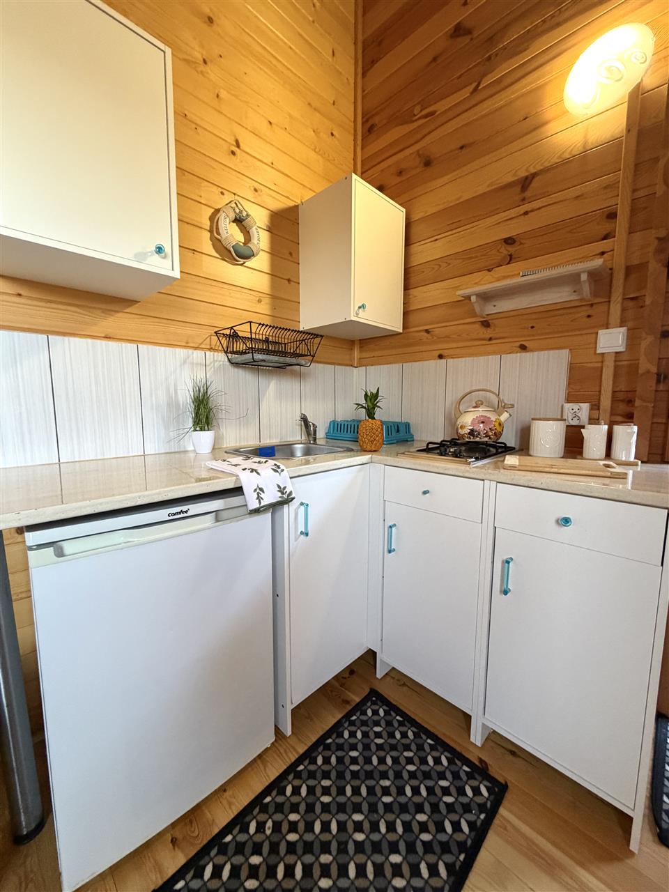 - instalacje: sieć elektryczna, wodno-kanalizacyjna. W kuchni aneks kuchenny z kuchenką gazową zasilaną z butli przenośnej