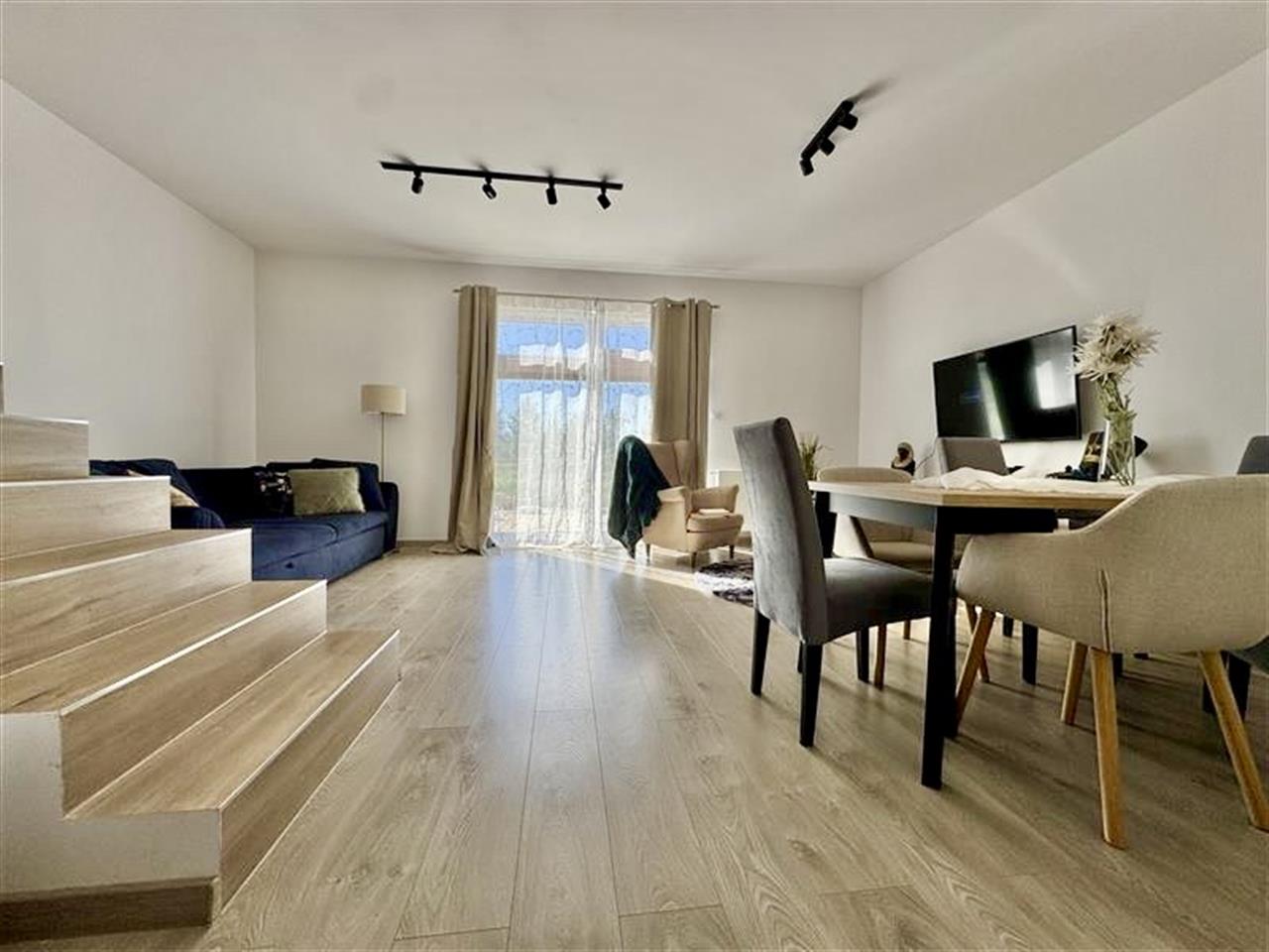 Jasny salon o pow. 23m2 - jasny i przestronny, stanowiący serce tego domu, idealne miejsce do wypoczynku i spotkań z rodziną lub przyjaciółmi. Duże przeszklenia zapewniają naturalne doświetlenie wnętrza i prowadzą bezpośrednio na prywatny ogródek o powierzchni ok. 250 m2, który stanowi doskonałe przedłużenie przestrzeni dziennej.
