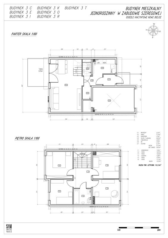 Oferta dotyczy domu w zabudowie szeregowej o powierzchni całkowitej 110,13 m2. Rozkład pomieszczeń: