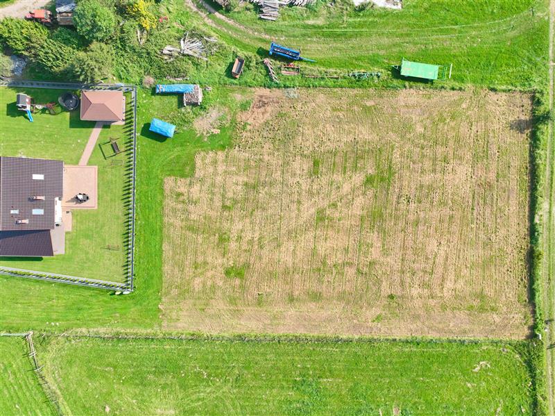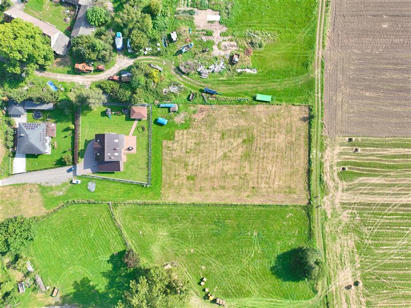 Działka jest w kształcie prostokąta, teren płaski, porośnięty trawą z drogą dojazdową gminną. Działka z idealnym nasłonecznieniem. W sąsiedztwie widoczna nowa zabudowa jednorodzinna.