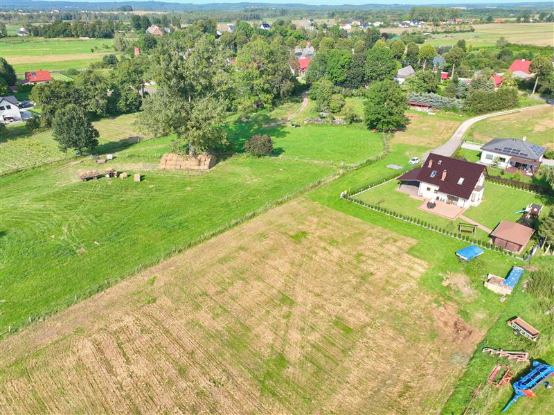 Działka jest w kształcie prostokąta, teren płaski, porośnięty trawą z drogą dojazdową gminną. Działka z idealnym nasłonecznieniem. W sąsiedztwie widoczna nowa zabudowa jednorodzinna.
