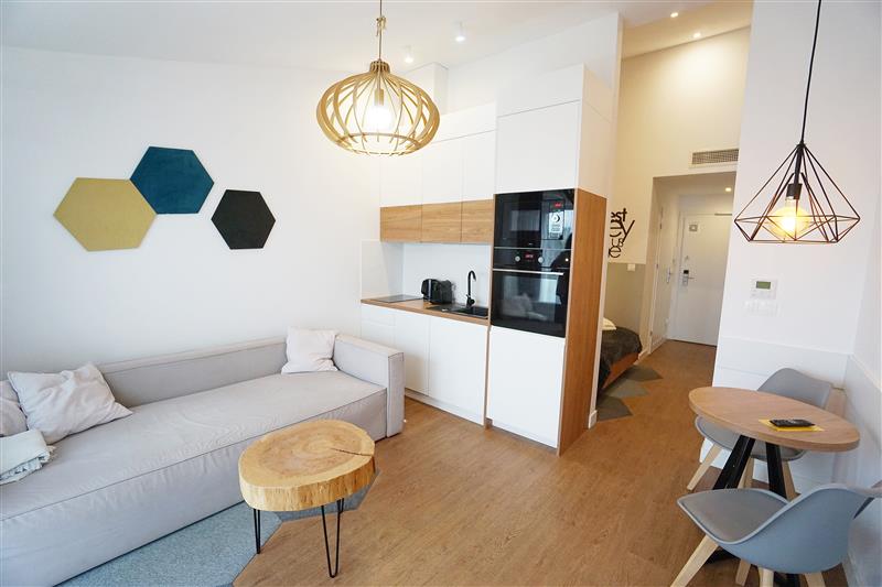 Mieszkanie składa się z salonu z funkcjonalnym aneksem kuchennym, w której znajduje się rozkładana sofa, posiada również osobną łazienkę z kabiną prysznicową, pralką, suszarką oraz przestronny korytarz z bardzo dużą szafą w zabudowie. Mieszkanie jest kompletnie wyposażone, gotowe do wynajęcia lub do własnego użytku. Kuchnia wyposażona w akcesoria kuchenne, zmywarkę, piekarnik, mikrofalówkę. W apartamencie można korzystać z bezpłatnego internetu Wi-fi, który zapewnia kompleks.
