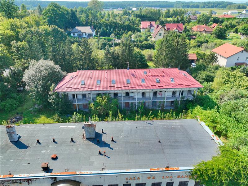 Budynek w trakcie budowy: Budynek dwukondygnacyjny w kształcie prostokąta, zlokalizowany równoległe do pierwszego obiektu, zaprojektowany pod motel. Budowa obejmuje wybudowanie na każdym z poziomów 7 segmentów mieszkalnych z sanitariatami o średniej powierzchni 24m2 ze schodami oraz galerią komunikacyjną zewnętrzną. Istnieje możliwość adaptacji poddasza na poddasze użytkowe pod dodatkowe powierzchnie mieszkalne. Dach stromy pokryty blacho dachówką w stanie dobrym.