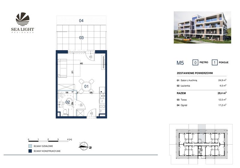 Prezentujemy jednopokojowy apartament o powierzchni 29,40 mkw z tarasem i ogródkiem położony na parterze.