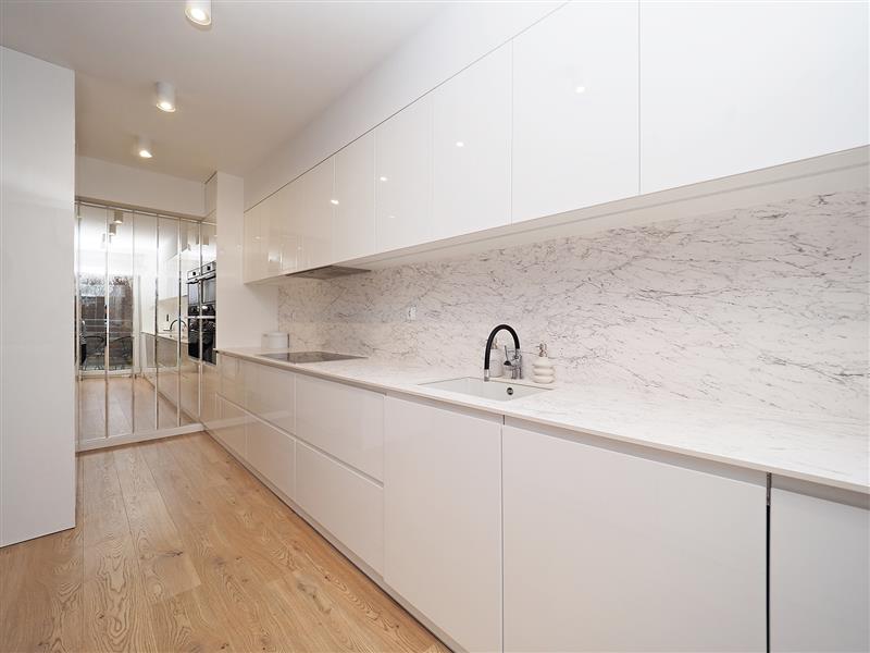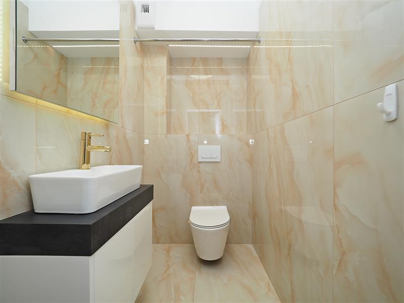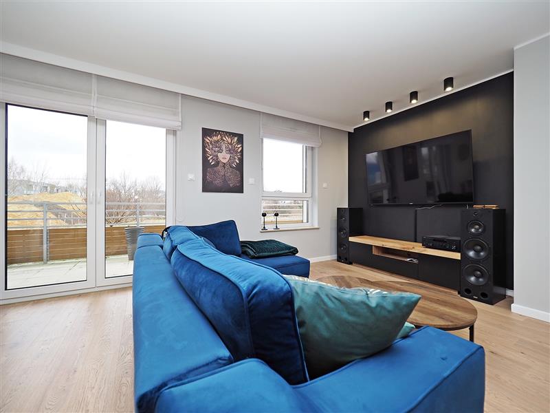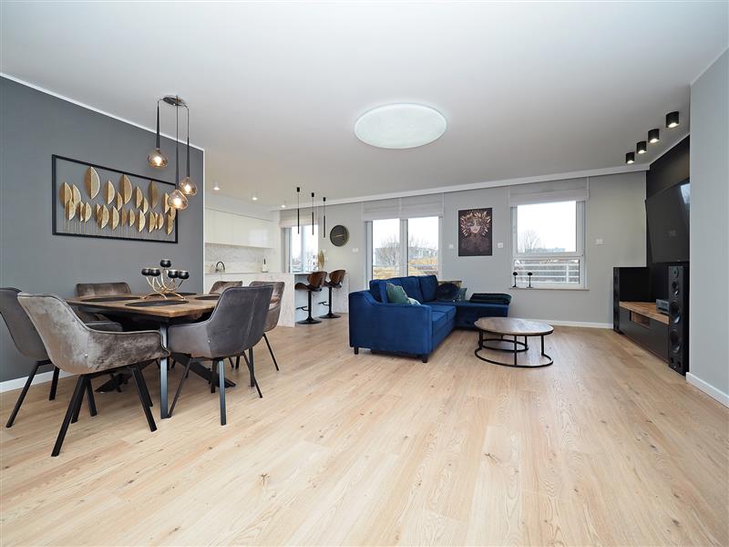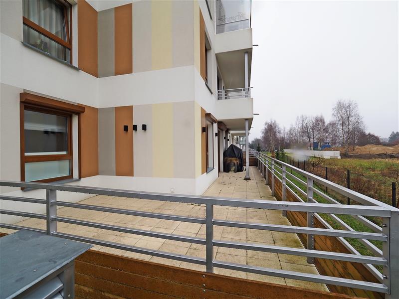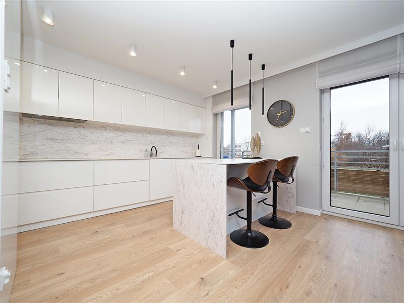 Z innych atutów mieszkania należy wspomnieć o przestronnej kuchni pod wymiar z blatami ze spieku kwarcowego, sprzętem AGD wysokiej klasy oraz wygospodarowanym miejscu na pralkę i suszarkę. Na tarasie wypoczynkowe meble ogrodowe.