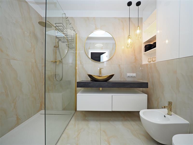 Od podstaw aranżowany z udziałem projektanta wnętrz przy użyciu wysokiej klasy materiałów.