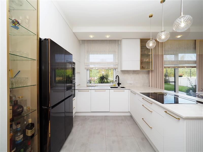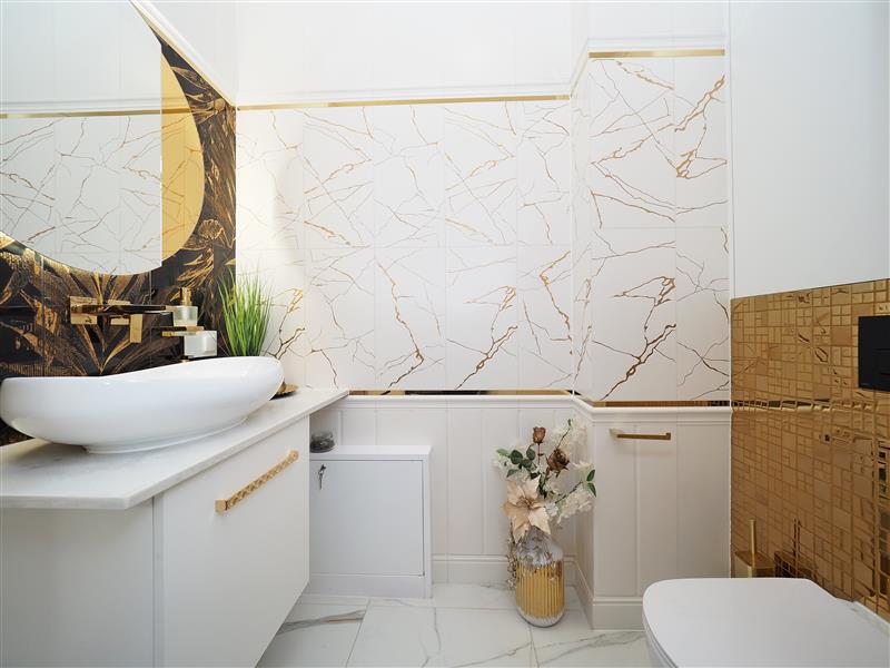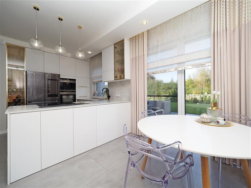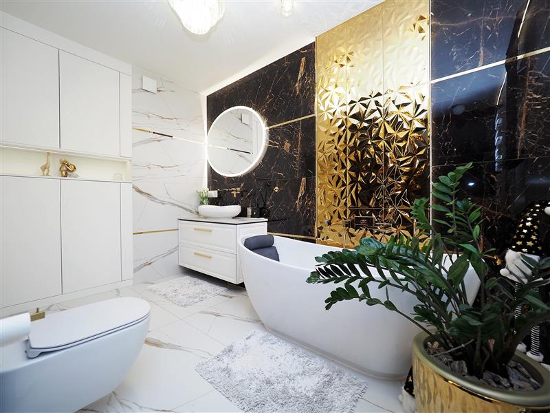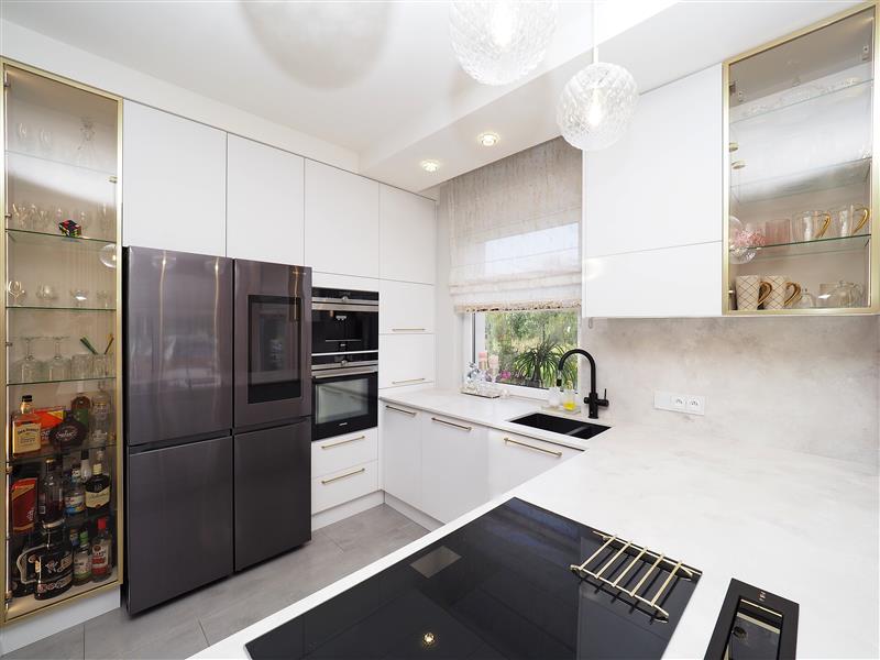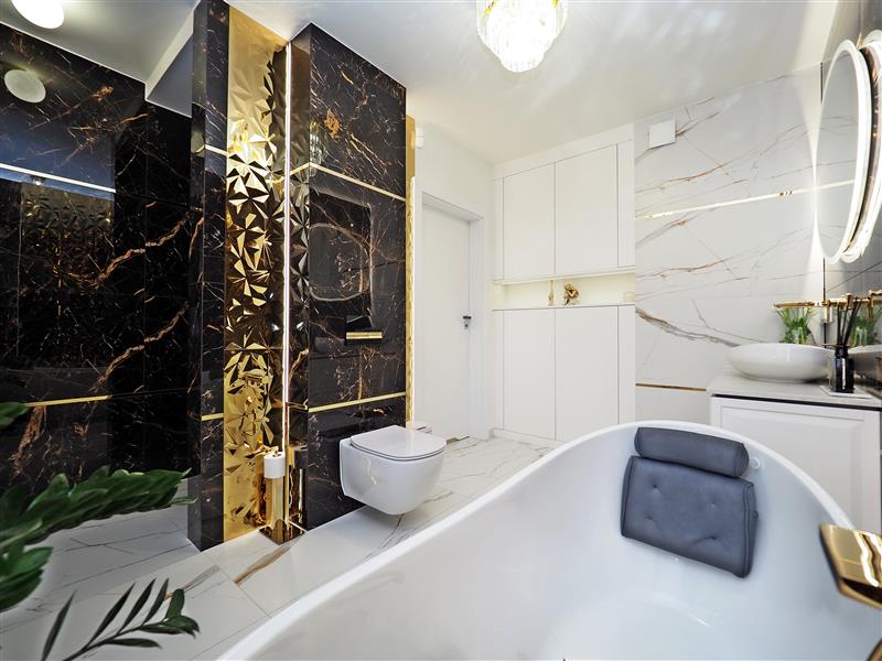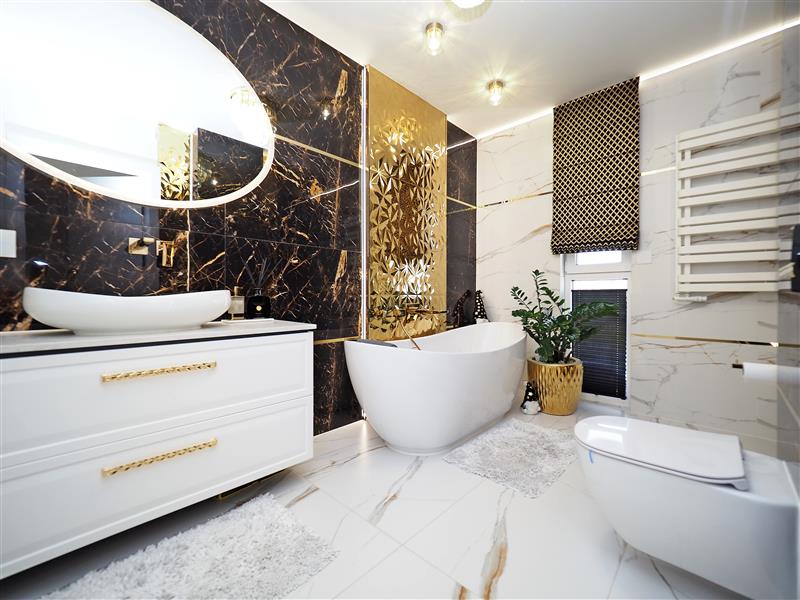 Kuchnia wykonana przez firmę Formi z kamiennymi blatami i złotymi elementami dekoracyjnymi. Wyposażona w wysokiej klasy sprzęt firmy Siemens ze sterowaniem przez WIFI. W cenie sprzęt AGD w zabudowie, czyli piekarnik z funkcją mikrofali, zmywarka, ekspres do kawy i pochłaniacz nablatowy. Łazienka i wc wykończona płytkami firmy Tubądzin, armatura firmy Hansgrohe. Drzwi wewnętrzne firmy Porta montowane przez firmę Domstyl, włączniki dotykowe firmy Simon.