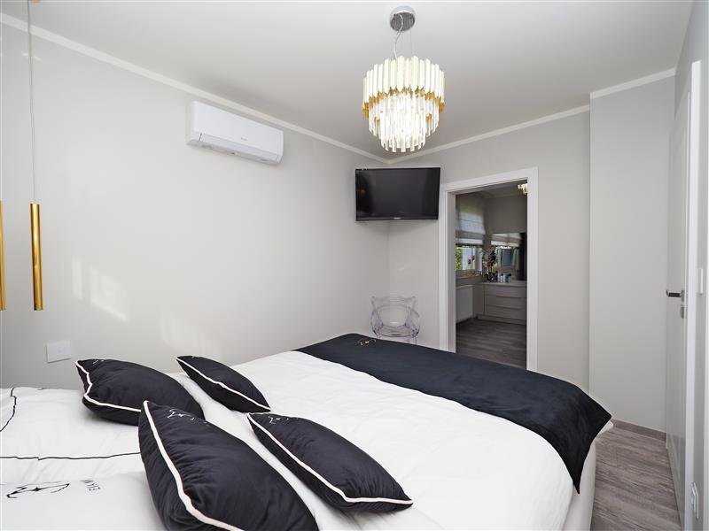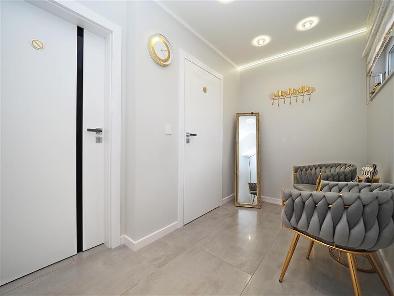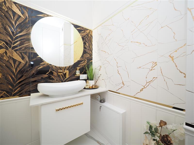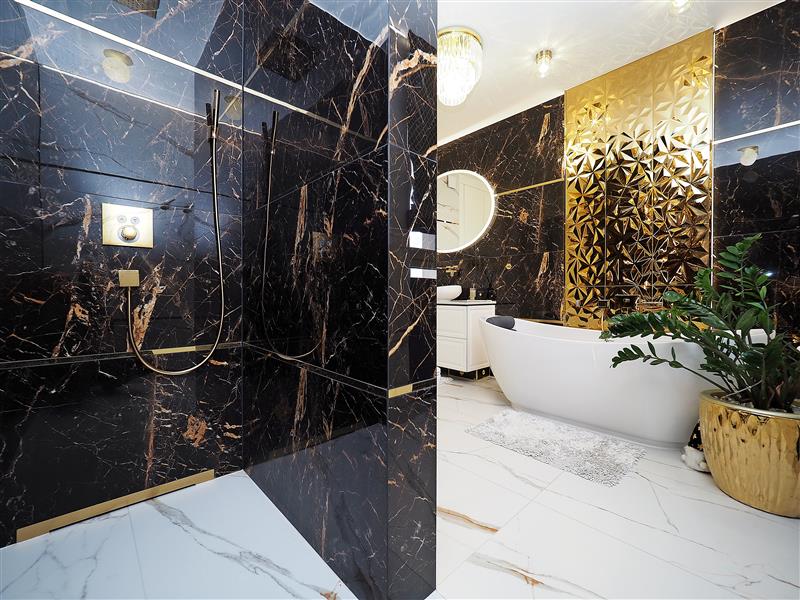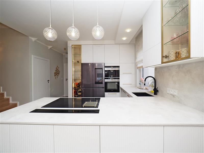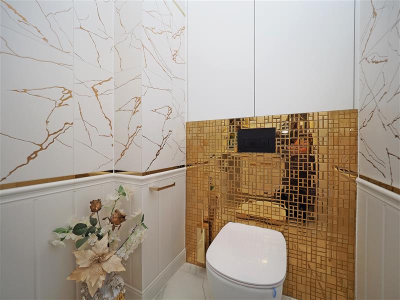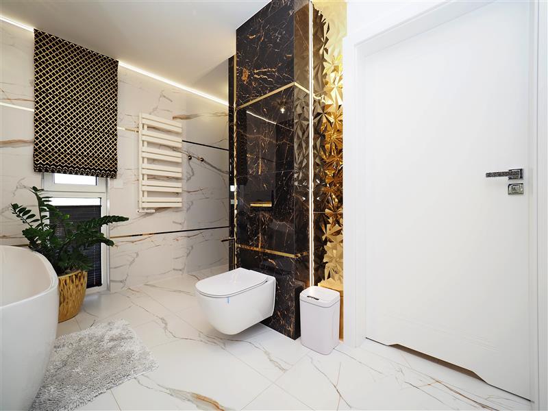 Kuchnia wykonana przez firmę Formi z kamiennymi blatami i złotymi elementami dekoracyjnymi. Wyposażona w wysokiej klasy sprzęt firmy Siemens ze sterowaniem przez WIFI. W cenie sprzęt AGD w zabudowie, czyli piekarnik z funkcją mikrofali, zmywarka, ekspres do kawy i pochłaniacz nablatowy. Łazienka i wc wykończona płytkami firmy Tubądzin, armatura firmy Hansgrohe. Drzwi wewnętrzne firmy Porta montowane przez firmę Domstyl, włączniki dotykowe firmy Simon.